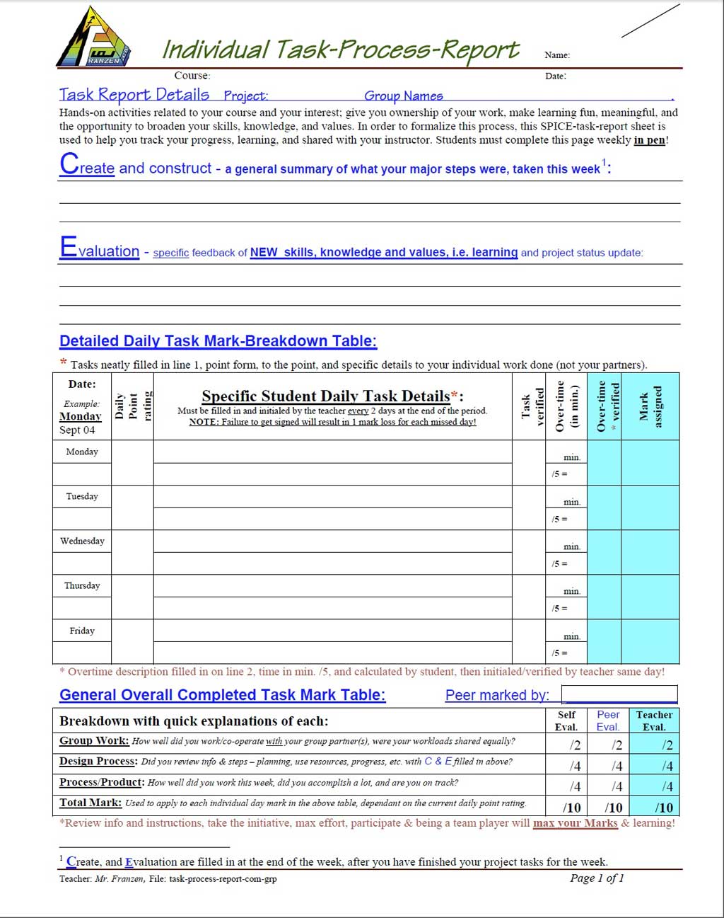 As you work on each task you are to fill in a couple of line showing what you have completed that period. Each period you will have some time at the beginning of class while the teacher takes care of administration and at the end of the period after clean-up.