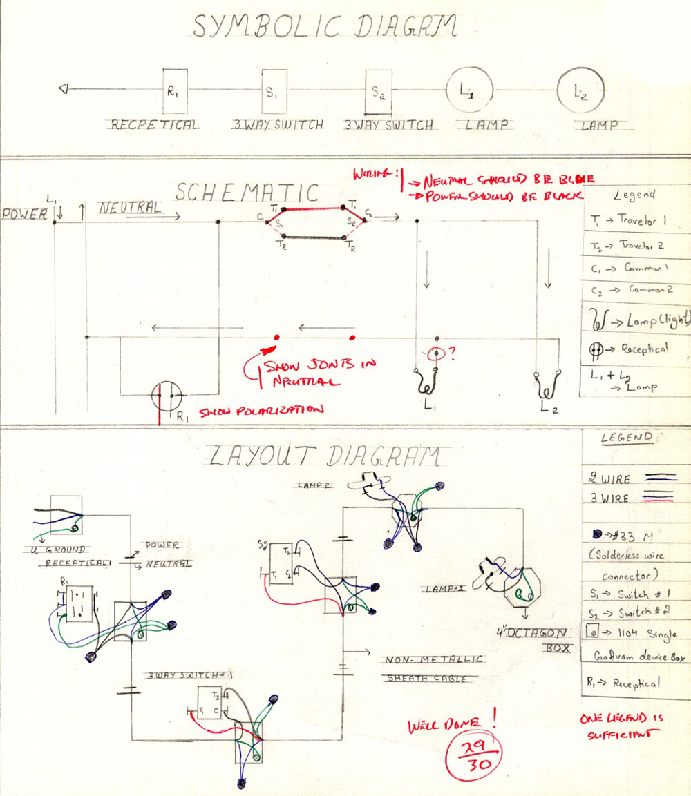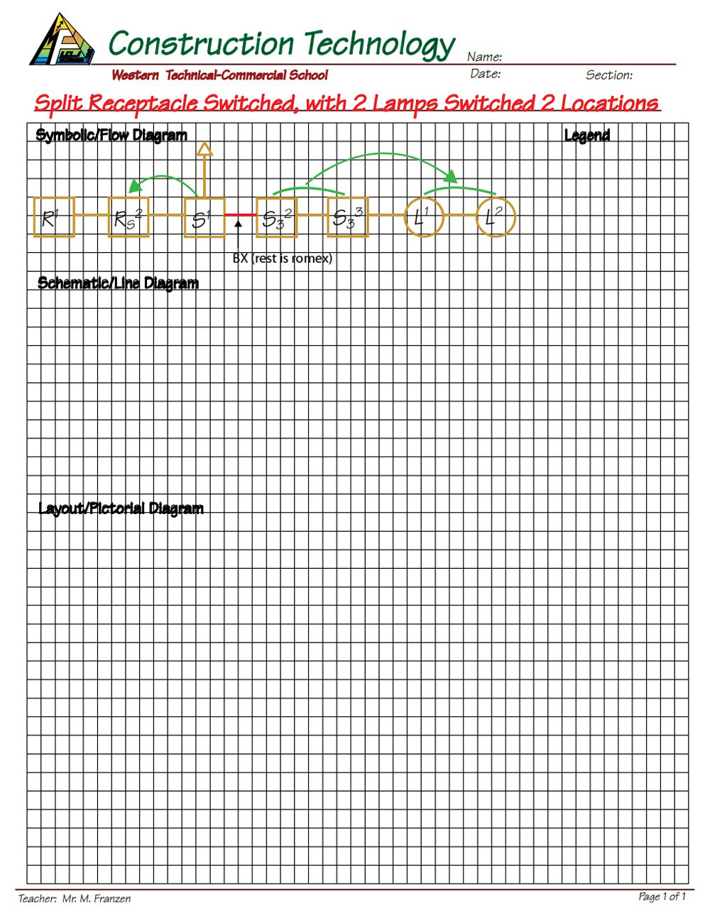Using three types of electrical wiring diagrams, namely: symbolic/flow, schematic/line, and layout/pictorial, neatly draw working common residential electrical circuits taking into account the hydro Code and trade standards. Use appropriate symbols, pictorials, and lines in pencil to create wiring diagrams and use colours for actual conductor wires.
