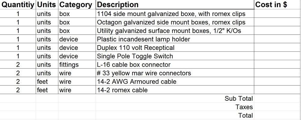 cost sheet on how much each your project costs by going out to a local hardware store and pricing out each of the materials including sub totals and final total.