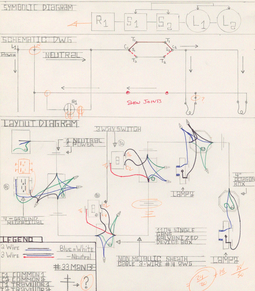 You will need to get yourself four colours preferably green(ground), blue(neutral/identified), black(primary power), red(secondary power). You will use a pencil to create the symbols and pictorials of the boxes, devices, and cables There are a number of areas that need to be reviewed in-order to accomplish this::