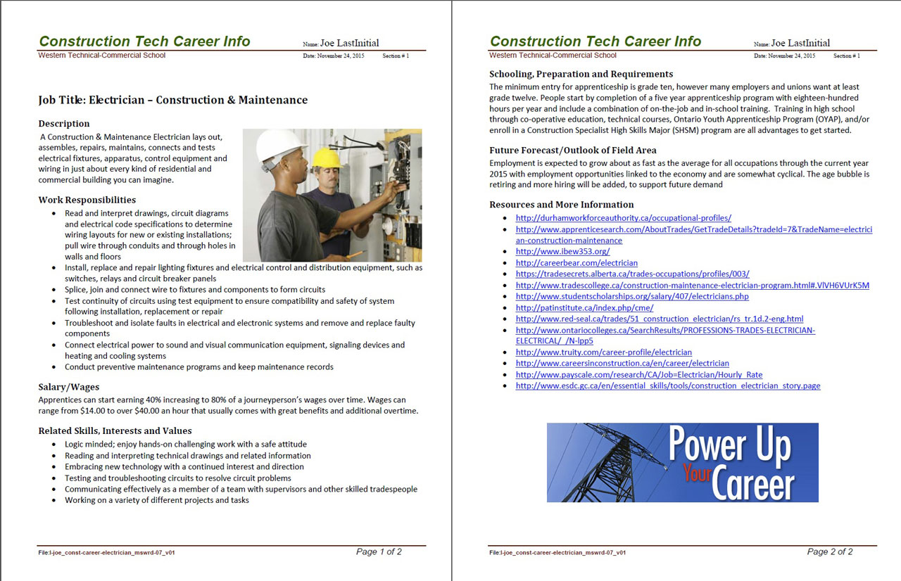 The first task involves selecting a related field in construction that you may feel interested in and researching details about that area. If you are having trouble deciding on which trade, you could try an Online Employability Skill an Attitude Quiz to help you decide which field might be best suited to look into. Below are some great resource links to assist with finding more information on your selected career field of construction you are interested in.:
