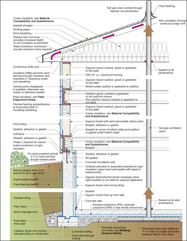 Being aware of the different materials used in home construction, their purpose, and how they interact with each other to form structures and being able to compare with similar structures that are familiar with will give students a deeper understanding of structure materials, how they fit, and their purpose as part of the whole structure. Below are some resources showing common/typical home build sectional view drawings, materials used, their placement, and how they fit as part of the whole structure.