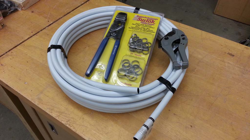 - Top Pex water tubing - measure and cut so that the Pex tubing length from the T to flush of the top plate taking into account the T fitting tube overlap connection.