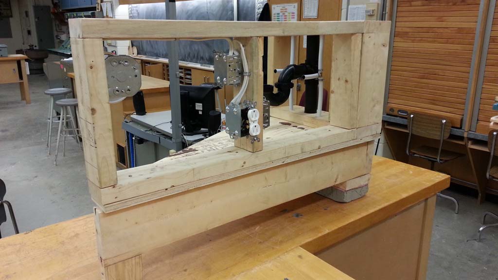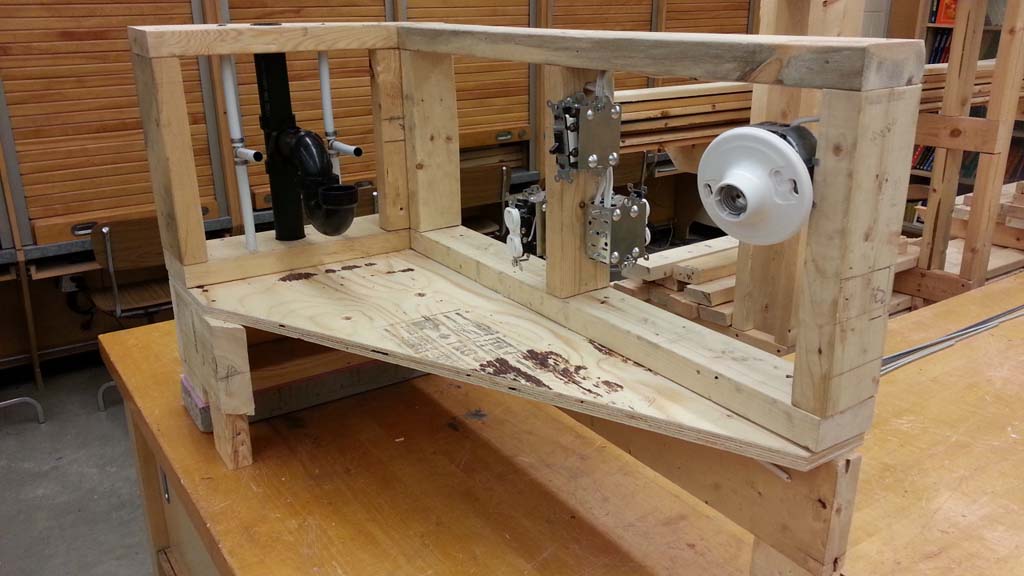 Construction Utilities Handout to explore and familiarize yourself with the basic and common utilities found in the home. For the practical part of this project you will follow the steps below to add the plumbing and electrical components to your project. The plumbing should be pretty straight forward and drain will be "dry fitted" rather than glued. The electrical you have already had some experience with, and as such should be able to show your knowledge, skills, and experience with excellent technique and quality install with the finished work. Each group will receive the appropriate materials to complete the work. Measure carefully as to not waste material. Click here to download print PDF version of steps below.