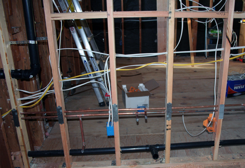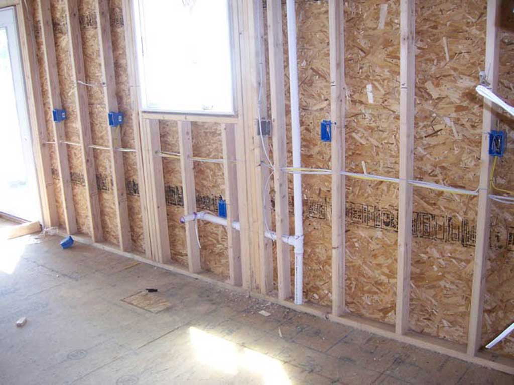With a sample foundation wall, sub floor, and two walls framed in, installation of utilities such as plumbing, drainage, electrical, ventilation, etc. are important parts of a homes operation.