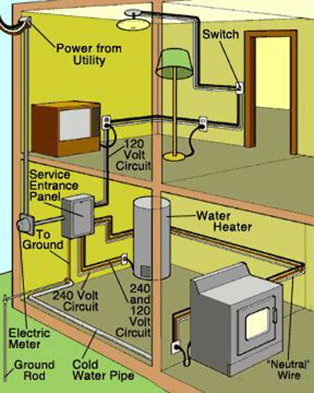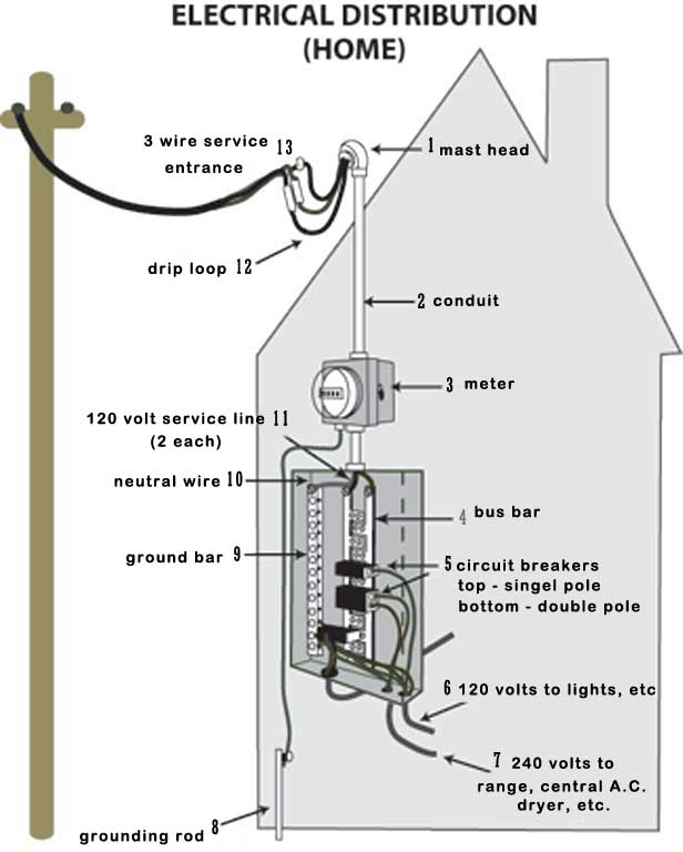 service panel. From the service distribution panel, individual circuits are used to distribute power through-out the home based on their amperage and type of