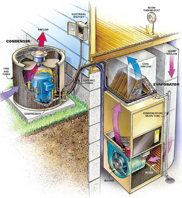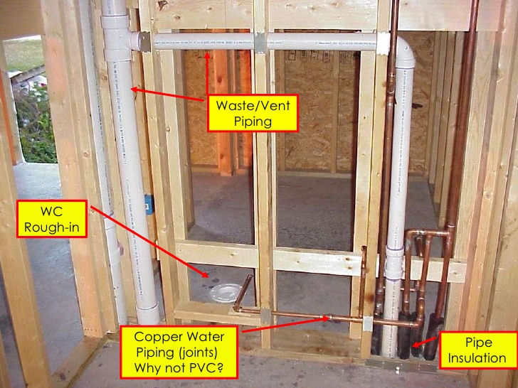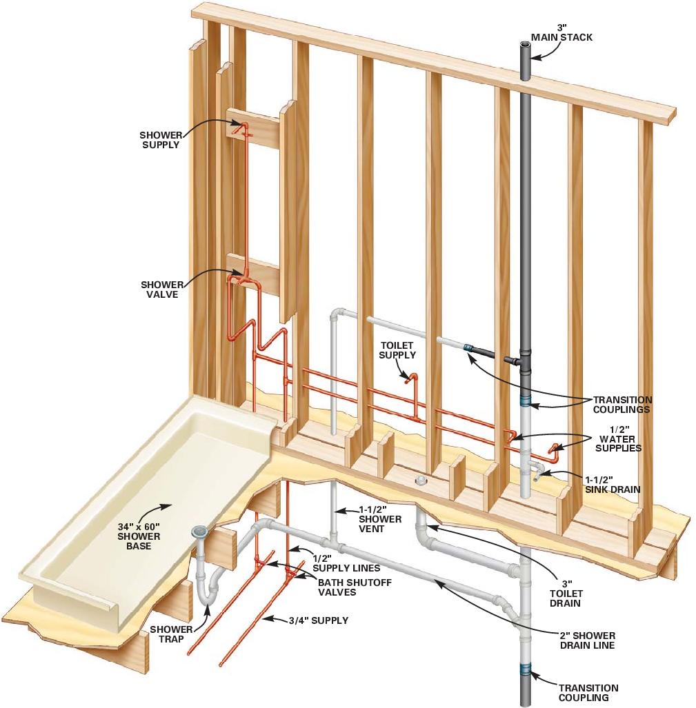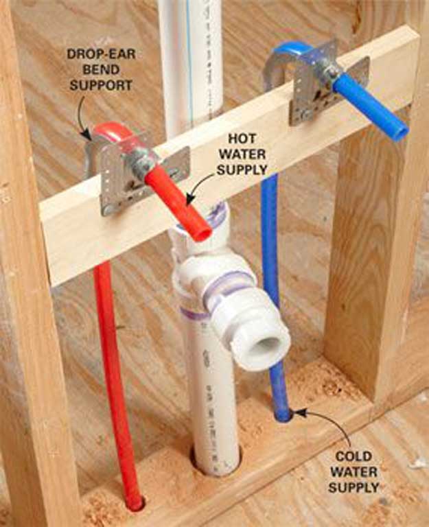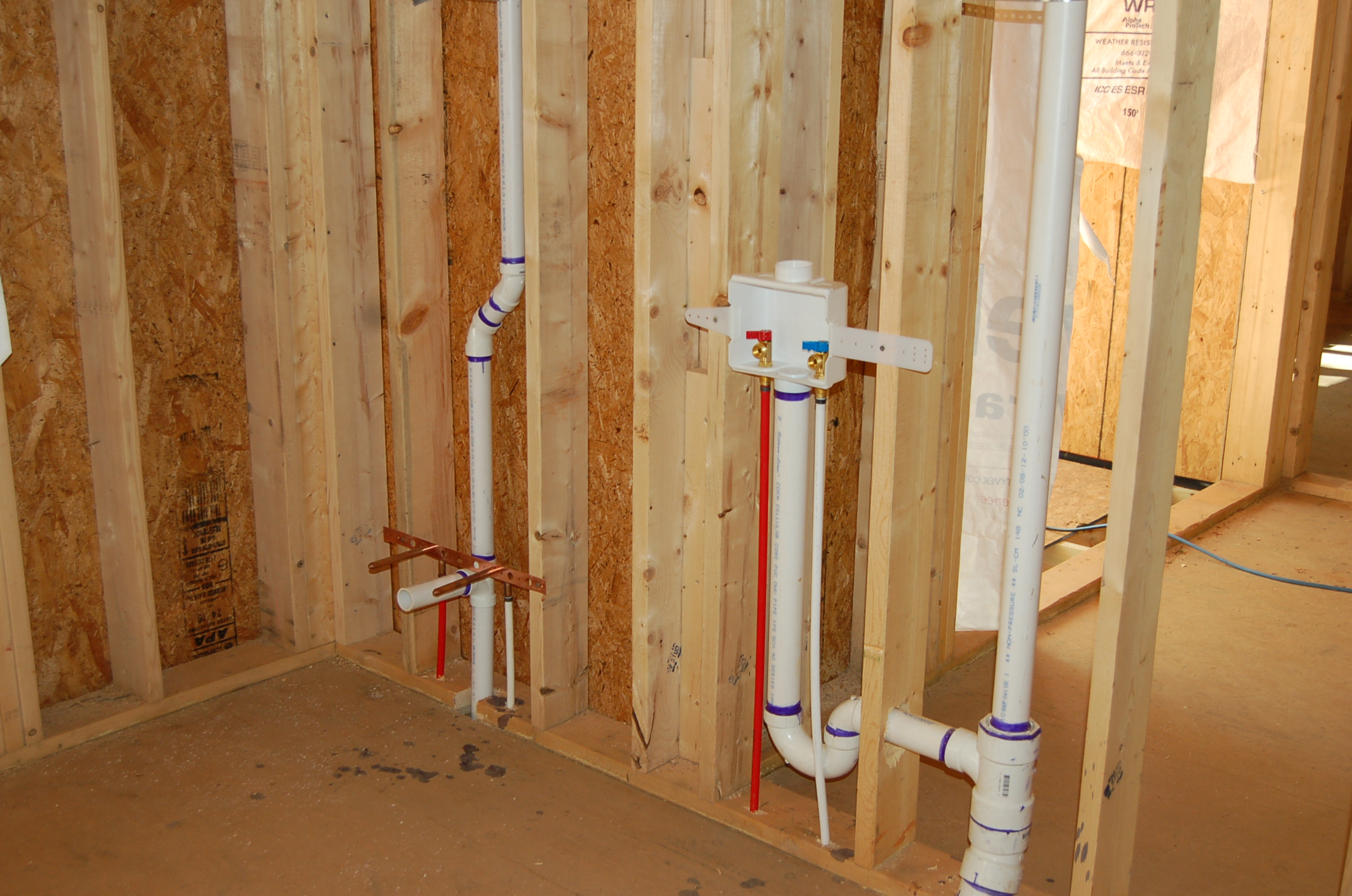 With water supply systems, the main pressurized water supply line enters the house with a pressure of about 50-60 psi (pounds per square inch, which is a measurement of pressure) below frost line, through a water meter, then splits into two lines with one supplying the cold water and the other connecting to the hot water heater. From there, the two lines supply hot and cold water to each fixture and/or appliance. Modern homes have a water