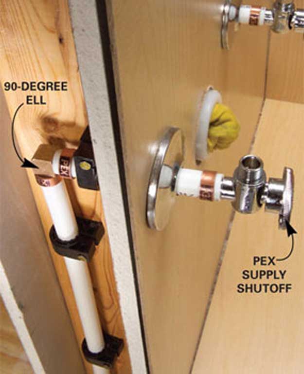 - 2*6 Base/top exterior wall plate plumbing layout, (see sample 15-18) - layout with pencil where wall studs are, and corner 2*4 corner blocking, then find mid point between them and mark centre (should be half of 5.5") for the 1.5" drain pipe, then measure over 3" either side for hot and cold 1/2" pex flex pipe centres and cross mark 1" from inside edge, then cut a second 2*6, 18.5" for your exterior top wall plate and layout the same