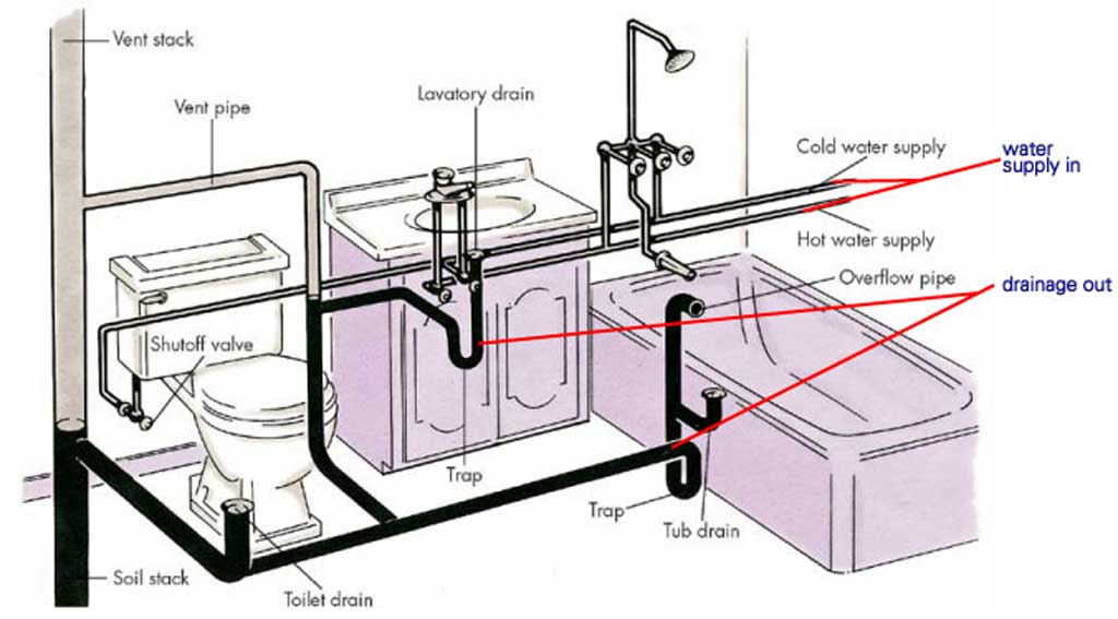 Drainage is another important part of the plumbing. A main stack connects all drainage and venting to roof. The main soil or waste stack, usually 4" size in diameter, is gravity fed from all drains in the home, and runs vertically from beneath the ground floor to above the roof line. The waste drains connect to the stack, directing waste downward to the main sewer drain, which then exits the home below frost line and ties into the municipal sewer system or runs to a personal septic system. Plumbing fixtures usually will have both a drain trap and vent. The drain trap is a u-shaped pipe that connects to the bottom of a sink, shower, or tub which retains a small amount of water that prevents the smelly sewer gases from backing up into the house. All plumbing fixtures require drain traps except the toilets, which comes with an internal trap built into their base. Vents allow the pressure to equalize on both sides of a trap, allowing the trap to hold the water effectively and avoid "trap suck-out" which otherwise might occur if not in place. For these drains to work optimal, a constant source of air through vents will prevent water locks causing clogs. All drains require ventilation, but a single vent, usually installed behind a sink, can serve additional fixtures and appliances that connect within 10 feet of a common drain line. Vent pipes, are generally 1.5 to 2 inches in diameter and connect to the stack in the attic. When a fixture sits too far from a common vent, it requires an additional vent piping, to connect to the stack or may exit the roof separately, depending on the home's layout.