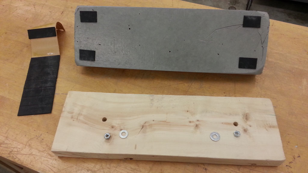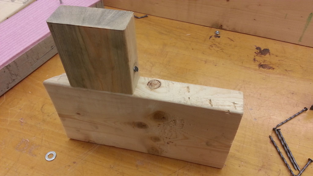 - Testing fit (see sample 5-6) - Put all your pieces together including your concrete foundation wall, using a couple of temporary blocks under the ends of the floor joists to ensure all parts fit together (note the sample wall studs you will be placing later in this project)