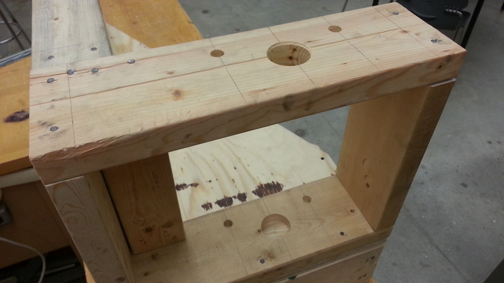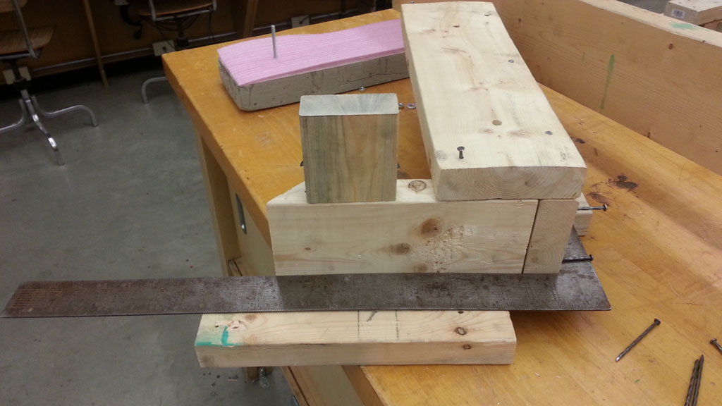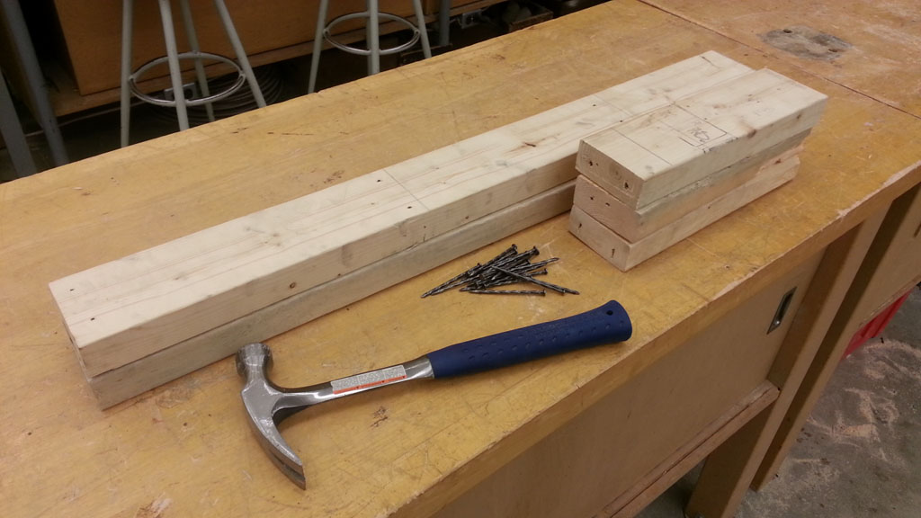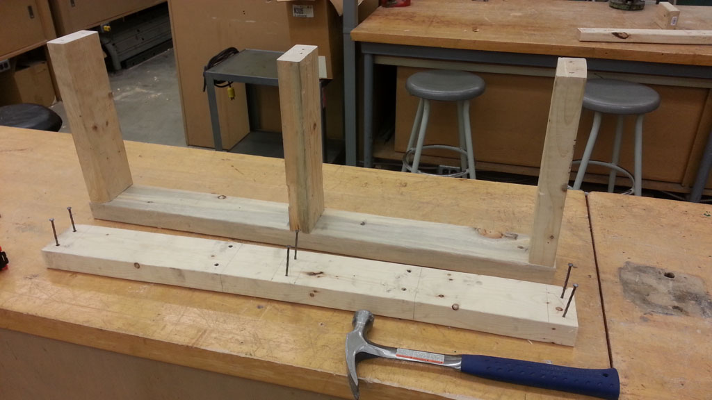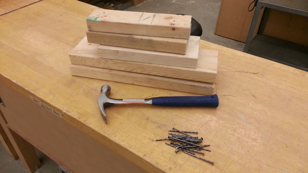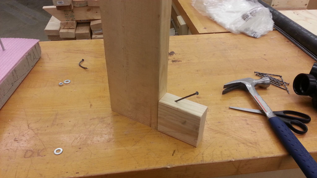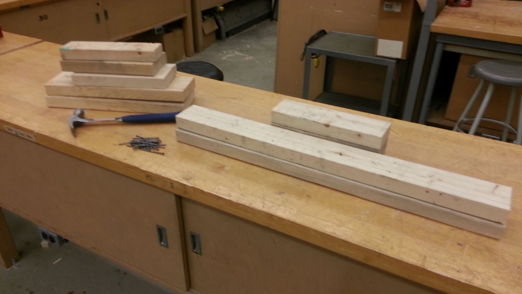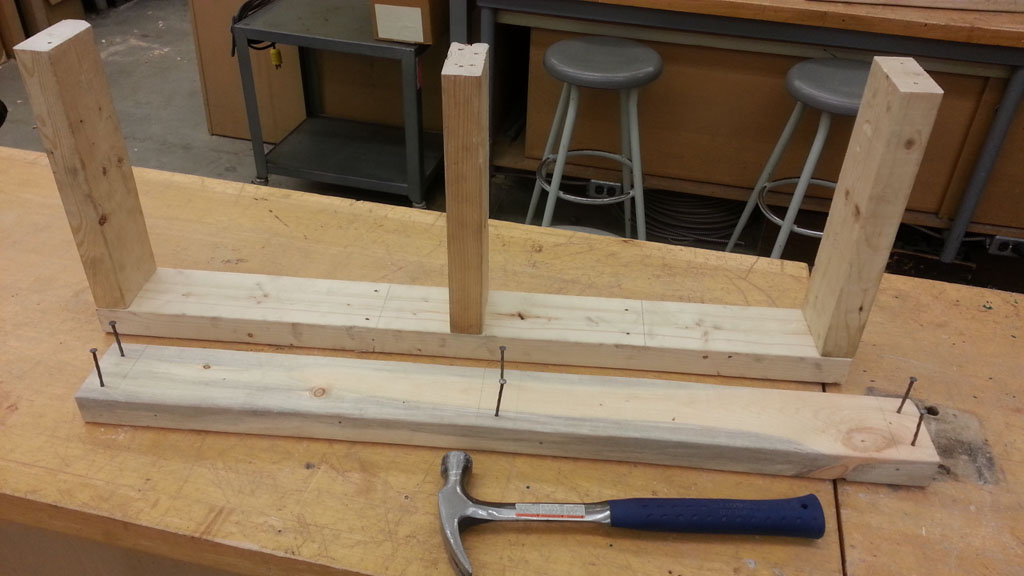 - 2*4 Framed wall nailed together, (see sample 23-25) - either take top or base plate and start nails where studs are, then line up studs and nail them in place, then take the other wall plate and do the same carefully nailing each piece accurately