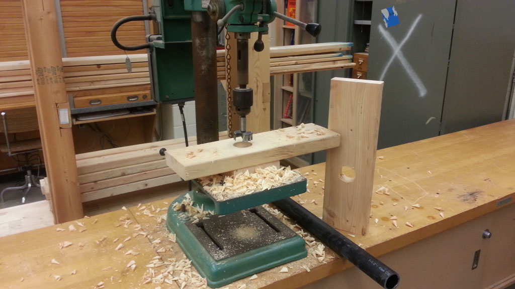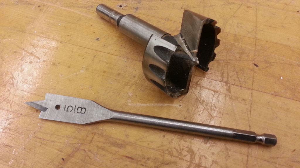 - 2*6 Base/top exterior wall plate plumbing hole cutting, (see sample 15-18) - for the top plate you are to drill right through and for the base plate only drill 3/4" into the top, for the drain pipe which you will drill a 1-7/8" using a Forstner bit, and for the two 1/2" water feed pex pipes use a 5/8" spade bit (also commonly known as a speed bit)