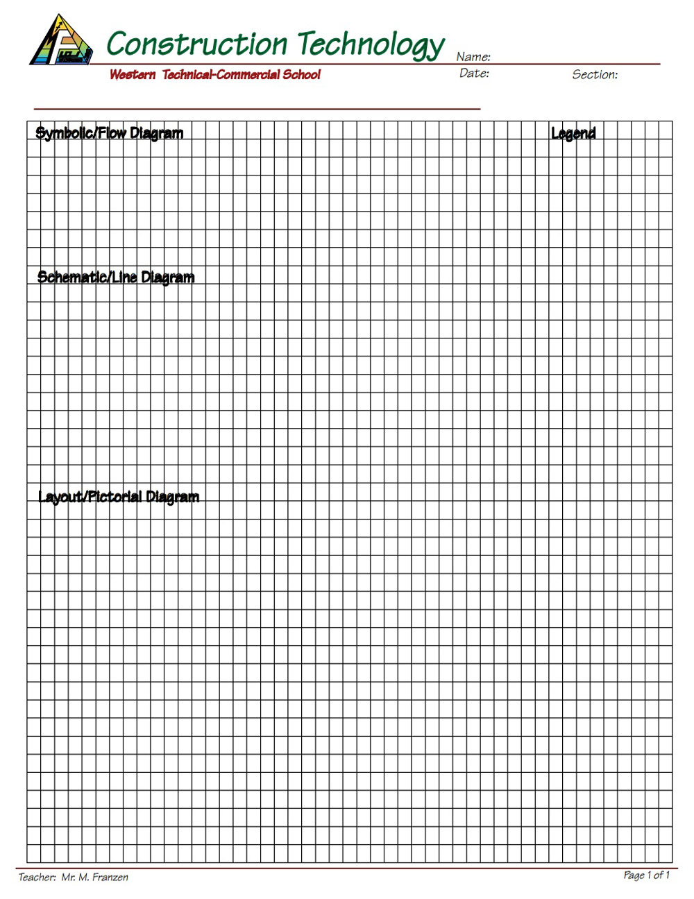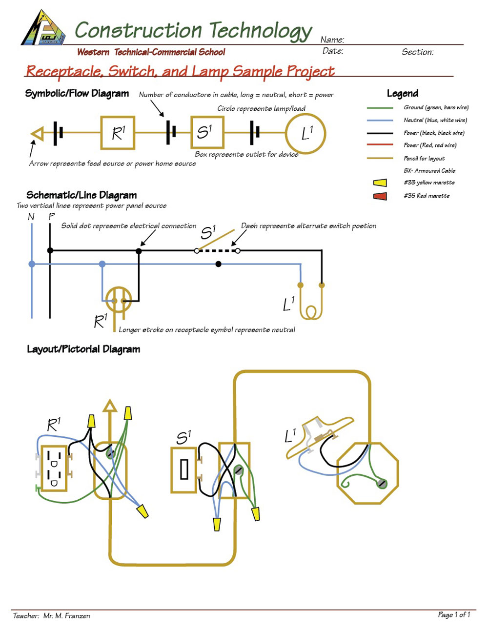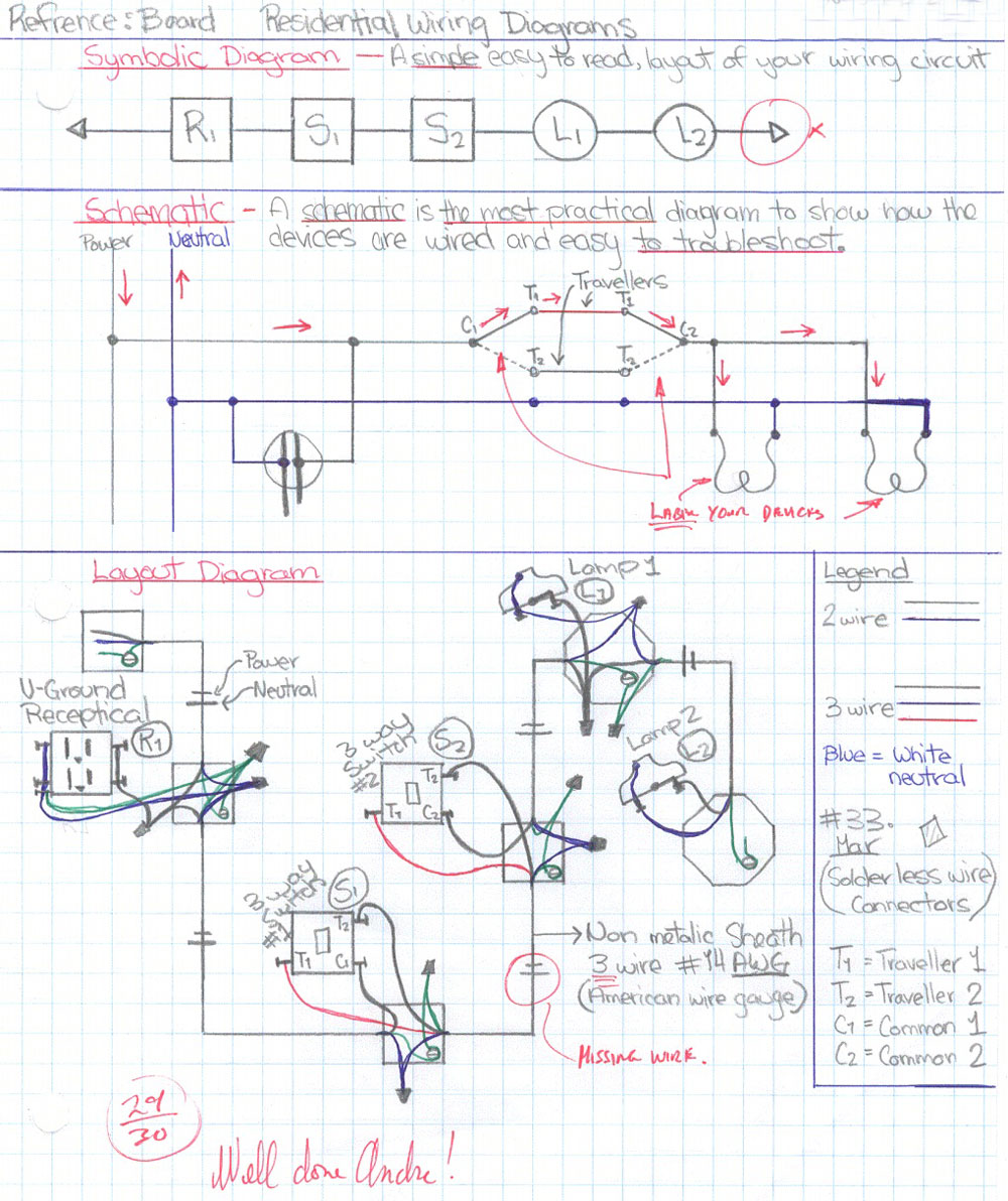 blank wiring template, individually draw out your electrical symbolic, schematic, and layout diagrams using pencil and after using legend with colour for the power (black), neutral (blue), and ground (green) similar to sample, to show how wires are connected and hand-in for evaluation - Box rough-in - Start by measuring and marking locations for each of your boxes. As this is a partial sample, receptacles will be mounted 4.5" OC above finished floor, with finished hard wood floor to be 1/2" above plywood sub-floor. Switch and octagon box to be mounted 9.5" OC from finished floor.
