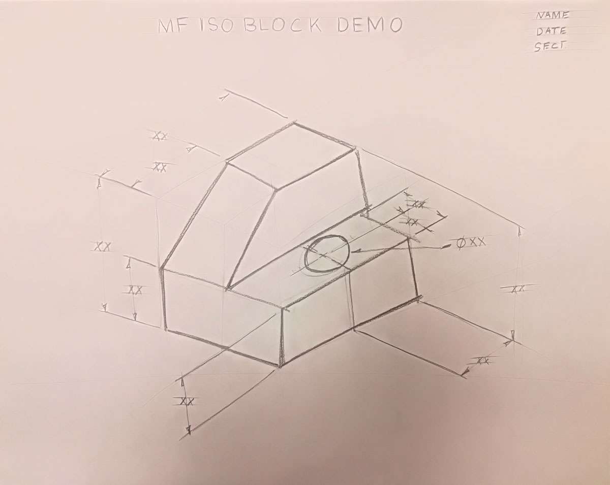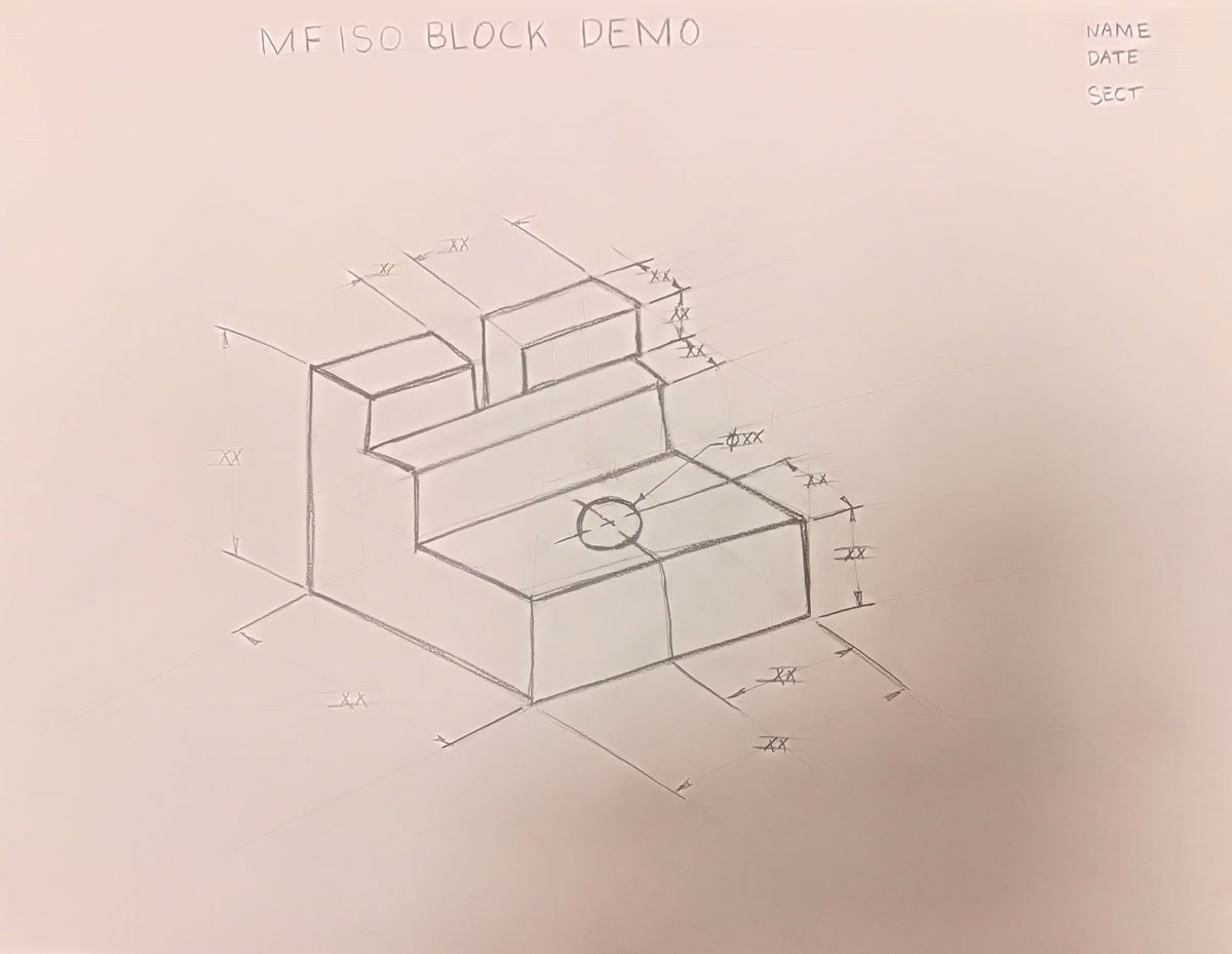 With the 10 ortho block challenges above, select a matched skil-leveled block sample at your current grade level/difficulty (recommend a level 5 for a student with 0-60%, level 6 for 60-70%, level 7 for 70-80%, etc) and create a full page sketch ISO showing best view with all dimensions needed to later complete a ortho sketch challenge. Use the sketching techniques and information you learned in your practice sketches and Ortho note, to further practice, refine, and demonstrate your new sketching abilities, knowledge of lines, shapes, and your recent Orthographic note, to show your new technical skills and knowledge. Remember while sketching an isometric view of of your block to use additive and subtractive sketching/build methods after laying out the page.