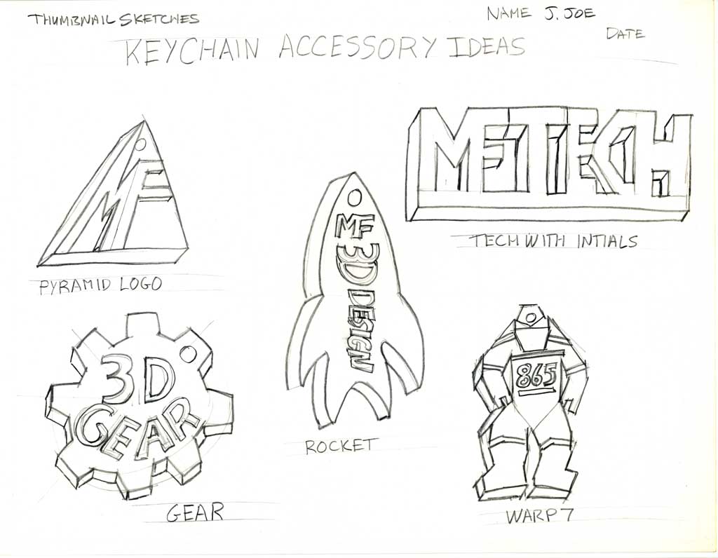 The following samples show what thumbnails would look like and how your orthographic sketches would look like when applied to other designs such as key ring accessory project. You can also check out these past student thumbnails and final ortho sketch designs.