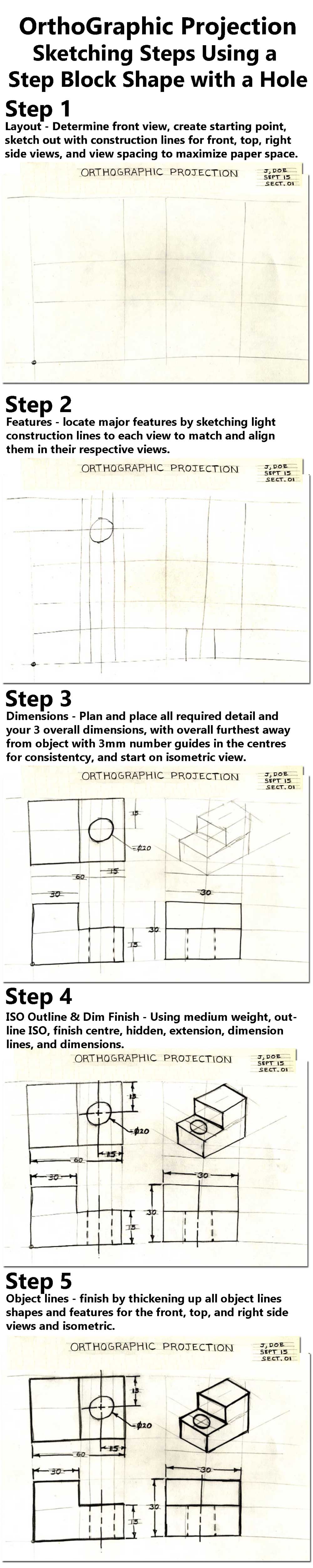 1 - 7 is a orthographic note, shows in order of creation, from layout, blocking in views, dimensioning, to a finished sketch. The following images below show a third angle projected orthographic sketch, dimensions, and isometric using a simple "step block" shape with a circular hole going through the center of the bottom step. In-class instruction will take you through the following steps in detail, so you can apply your new learning to other shapes.