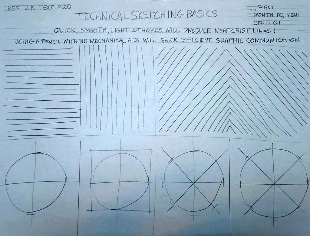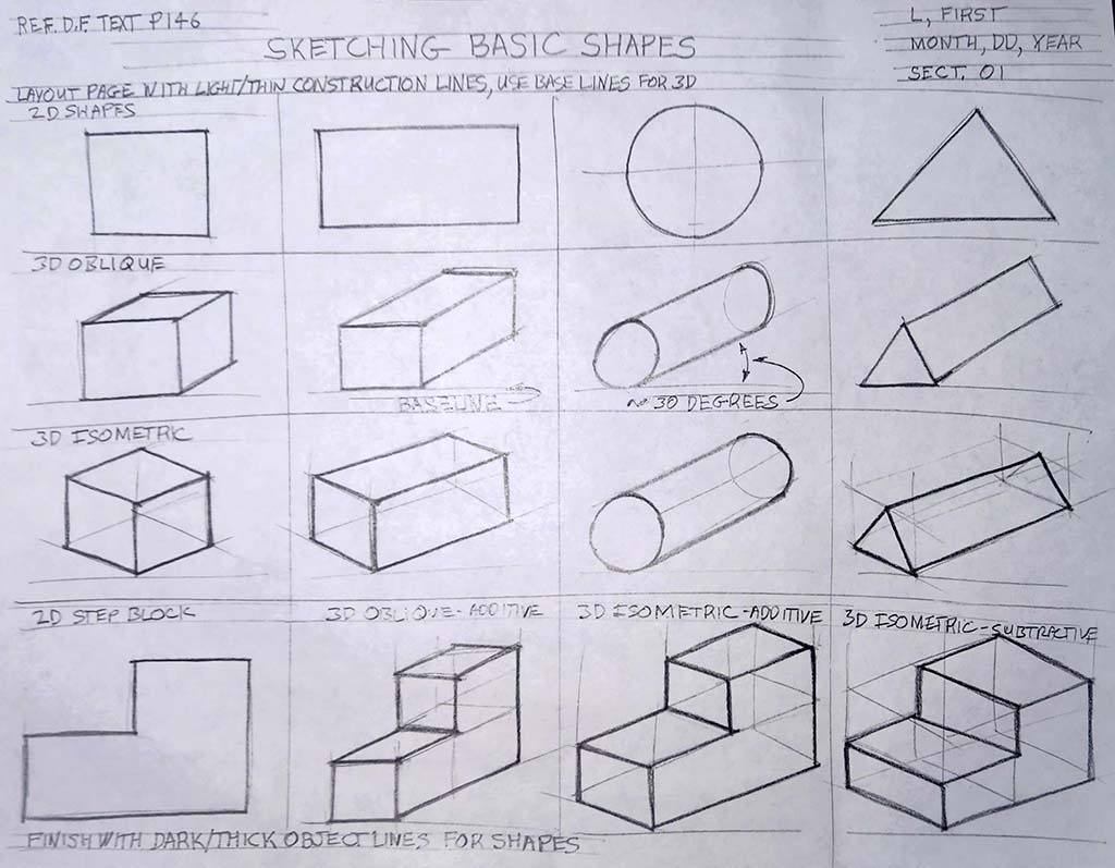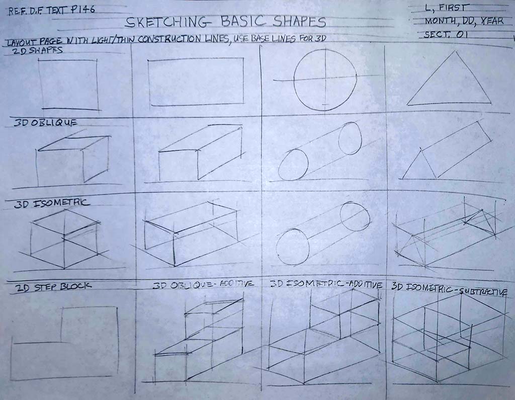 Practice your sketching techniques with sketching practice assignments while learning about engineering drawing standards. As sketching is the fastest way to communicate, learn, and practice these standards, we will use several related assignments to fast forward our knowledge and skills to better prepare for application in CAD programs in the near future. These sketching projects will include: