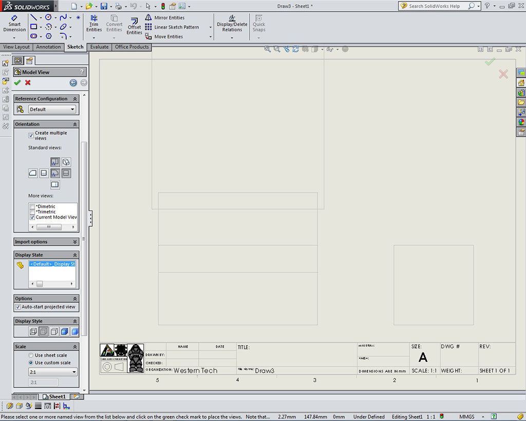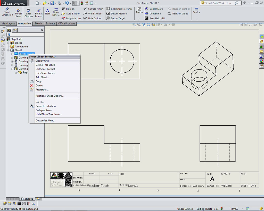 9. Turn Grid on: Using menu in feature tree click on sheet format and click on display grid. This will help with final dimension placement and organization.
