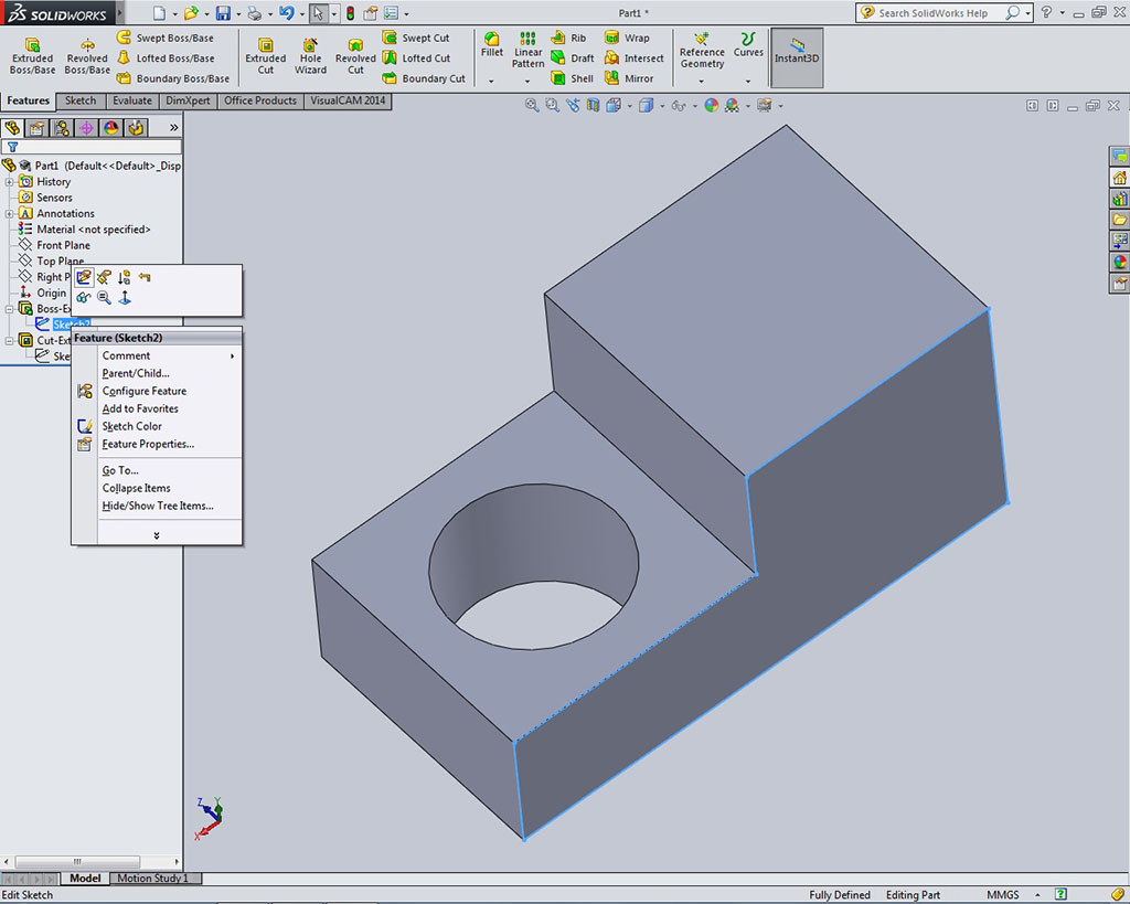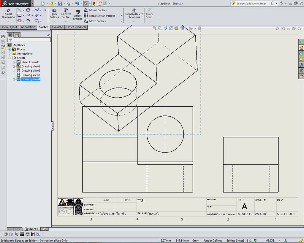 Two unique research pages on Solidworks Expert 2D Tools and 3D Features will be created with supplied template to research and share with class. Students will review and learn about SolidWorks and it's history, then using our familiar object, the step block, create the object in SolidWorks.