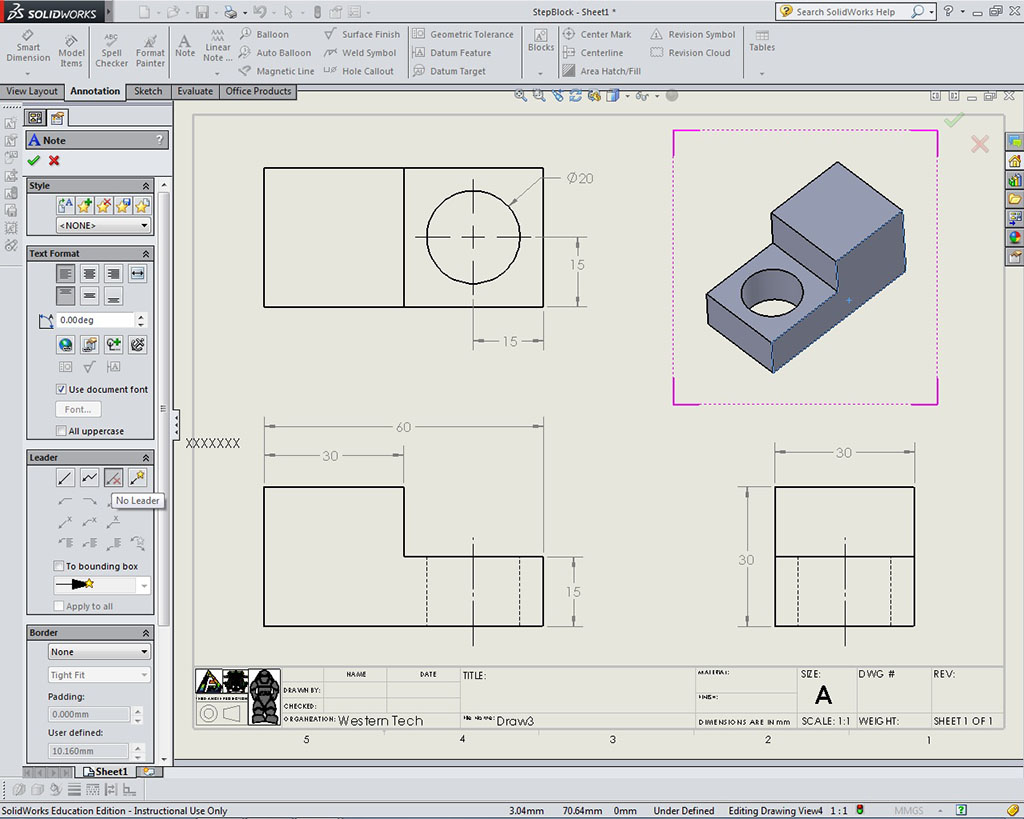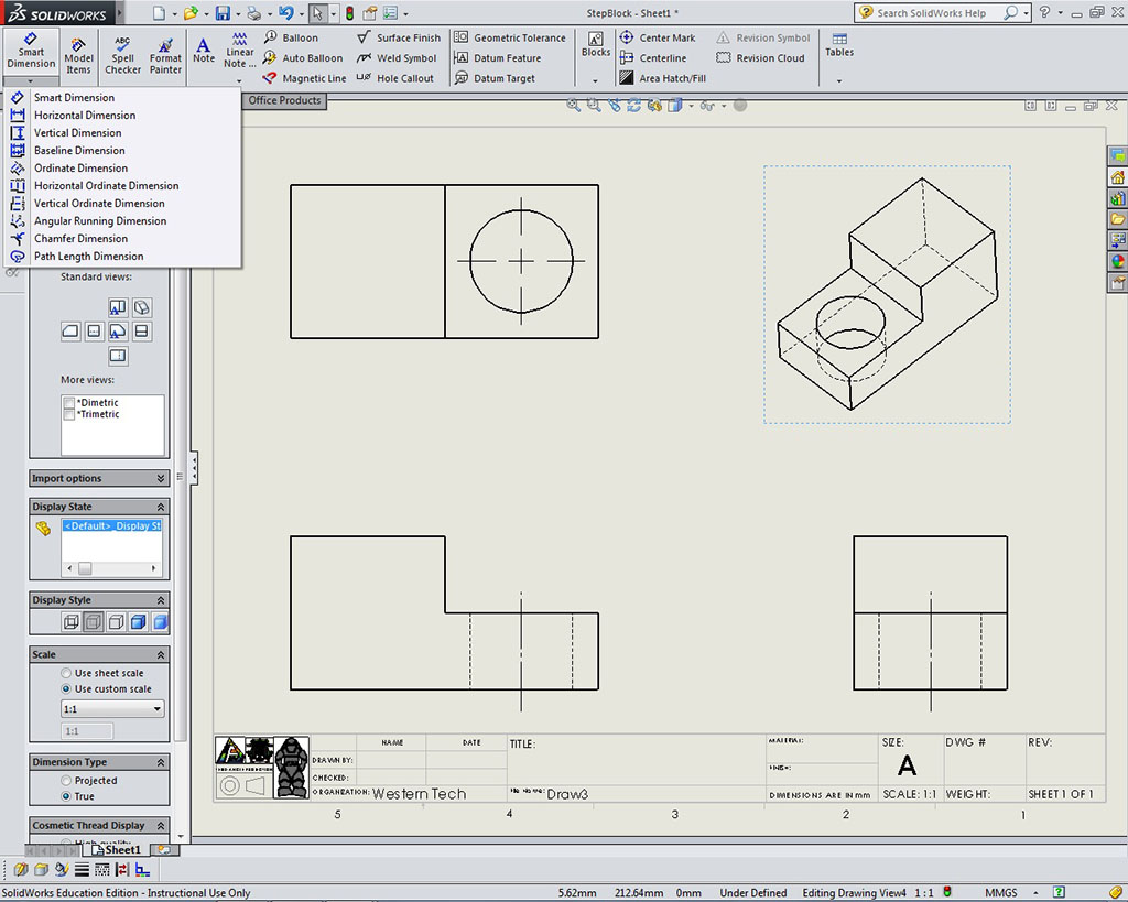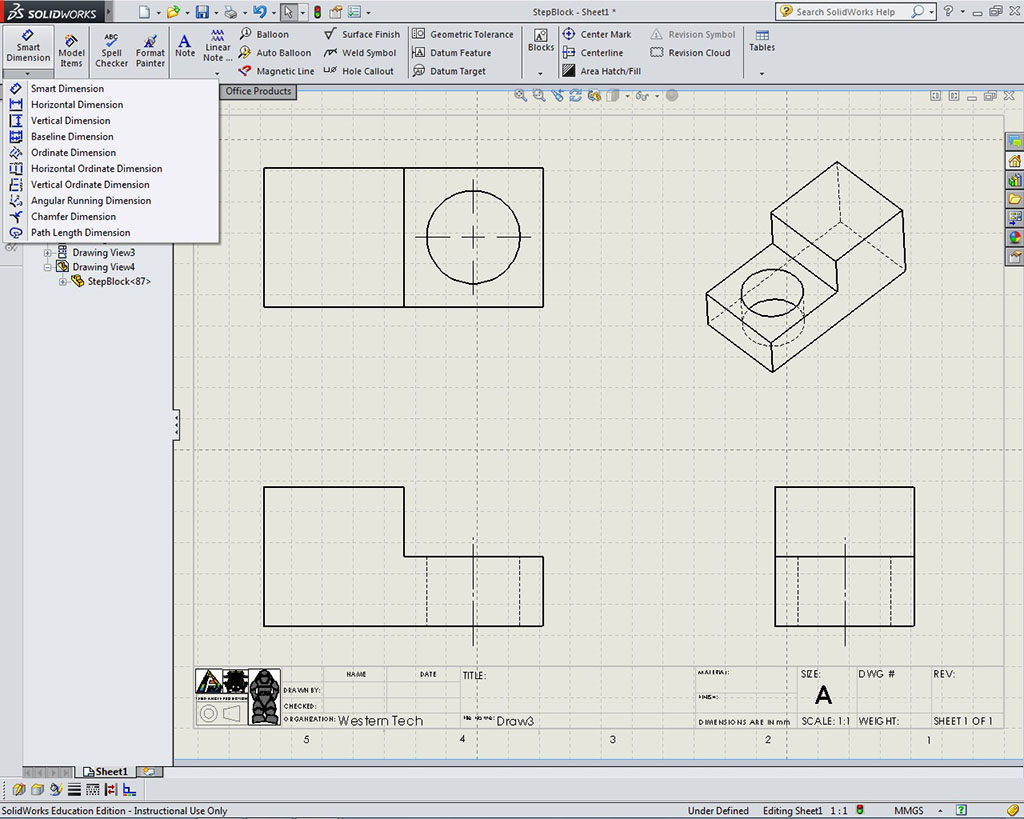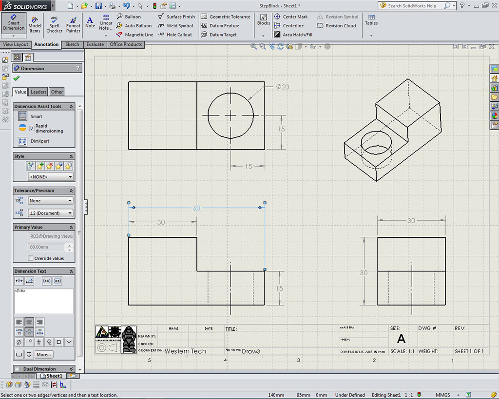 Creating 3D model in SolidWorks with the step block should be straight forward using the steps, pictures, and instructions given. Students should be aware of key information as they go through this step block tutorial such as parametric driven, integrated 3D CAD/CAM/CAE solution, used by discrete manufacturers for mechanical engineering, design and manufacturing. With all of the previous experience with sketching, drawing views, selecting the front view, dimensioning, 2D drawing, and 3D introductory modeling, this should be easy to pick up the basics, as you are already familiar with the previous programs used. The tutorial in the next section will guide you step by step to support the creation of your customized key ring accessory.