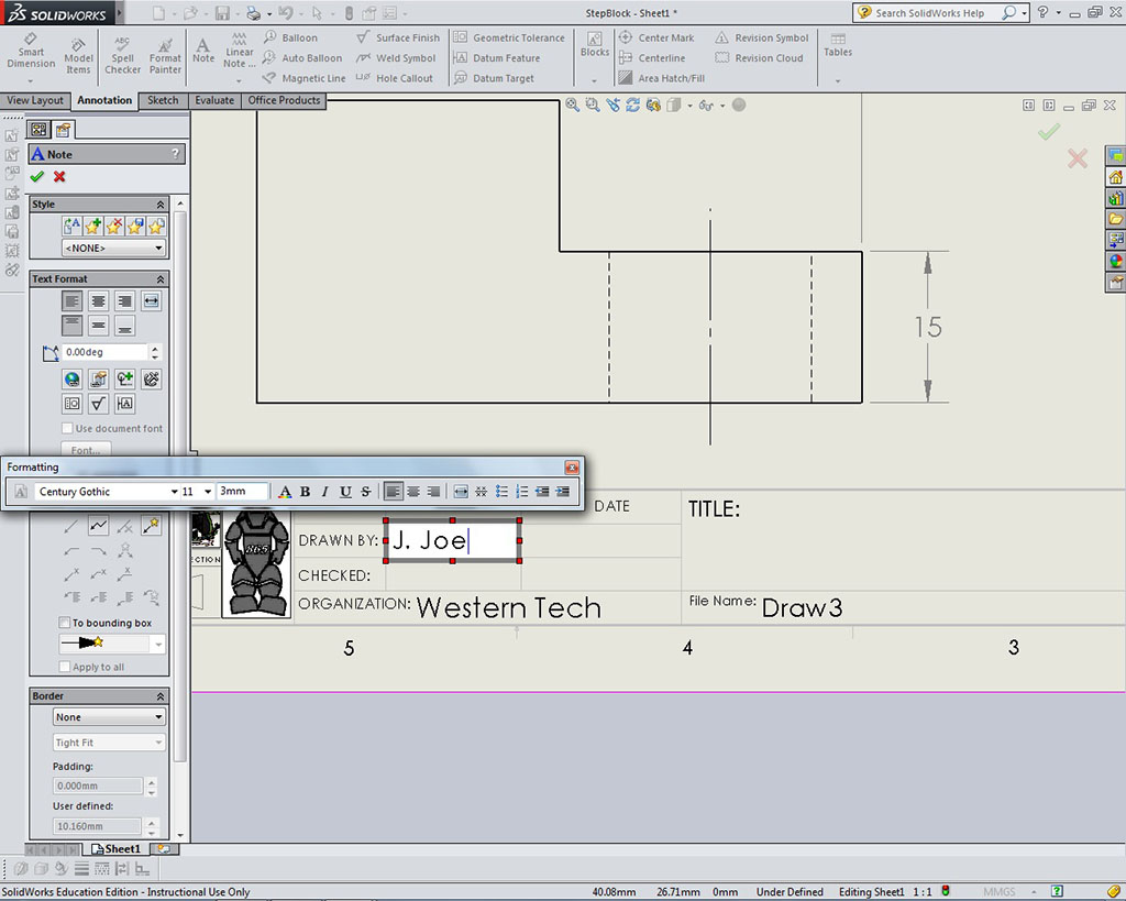 15. Fill-in Information: When clicking in a location to make a note to type some text, note the long formating box that pops up with all the options you have. Most of this information should have been filled in with the exception of the sheet scale. If not check your model custom information that was done when creating the model earlier