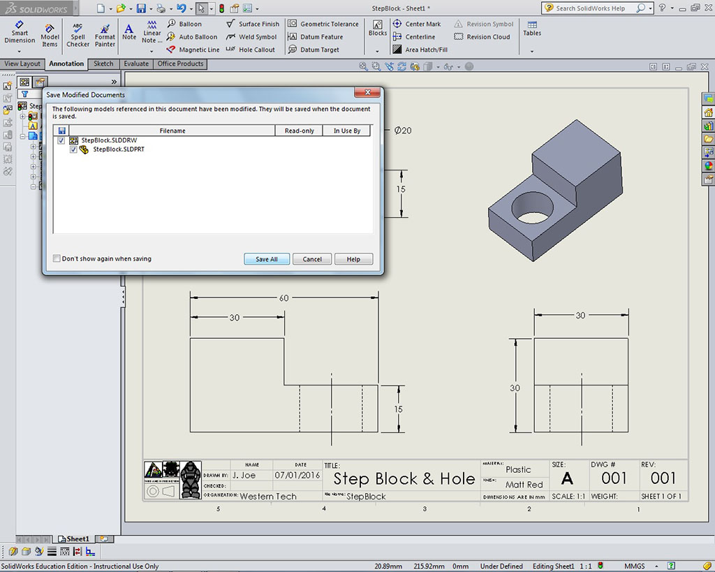 TioEnsure you have a folder, example folder name: td2-1_d-joe_step-block inside your class folder on your USB flash drive so that you can save all related model files together for ease of use, organization, and for handing into the drop-off folder later. For files use appropriate file naming convention, example: td2-01_d-joe-step-block_P_60x30x30mm.sldprt