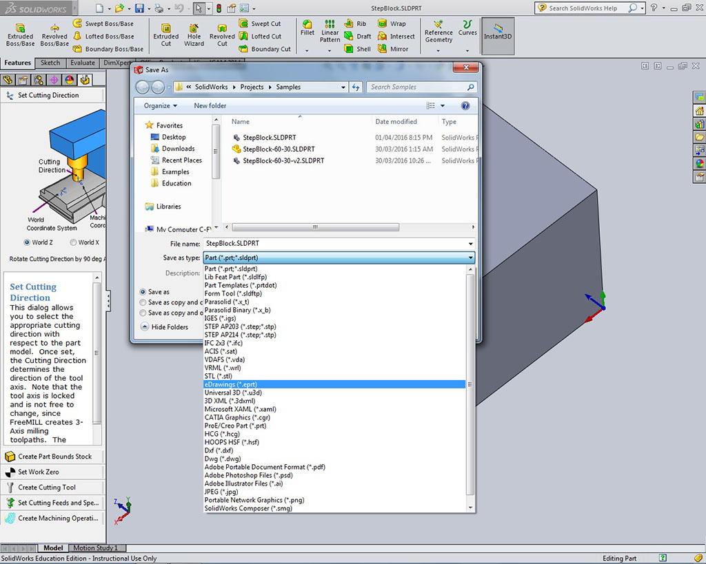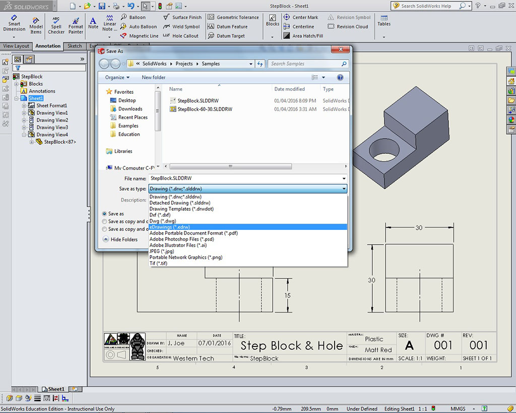 For this project practice, you hand in the above file formats in a folder using CAD folder/file naming convention: Using your USB flash drive, create a folder, for example: td2-1_d-joe_step-block. For the file naming, save correctly the first time (to prevent future file reference problems) with the proper file naming convention, ex: td2-1_d-joe_step-block_P_60x30x30mm.SLDPRT. The underscores separate sections of the file/folder name, dashes separate but keep the file name sections together, the P represents "Part" vs other file types such as assemblies and drawings, and the last part is a description, in this case the size of object.