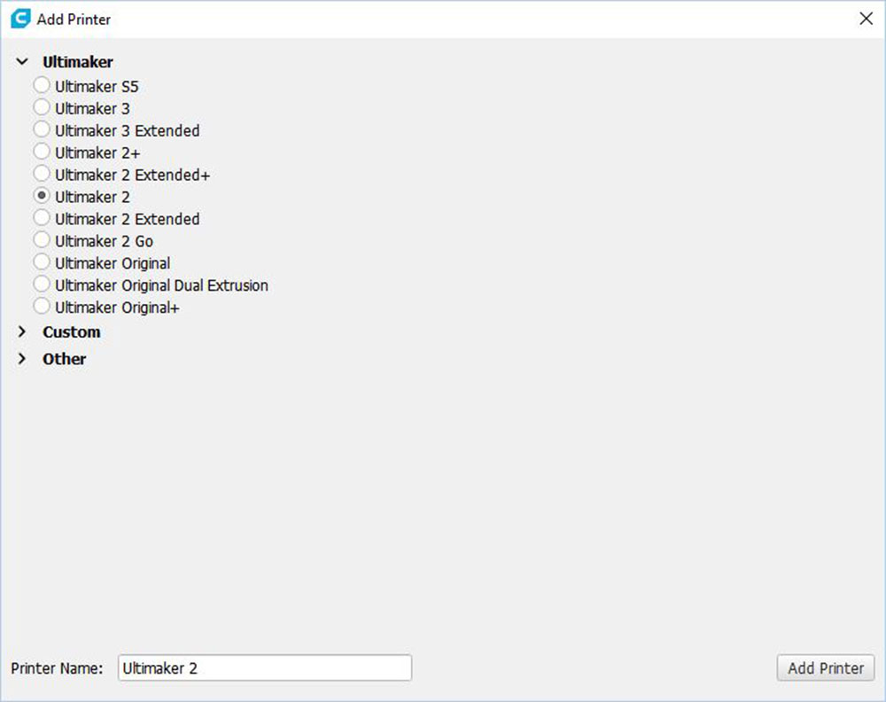 - Select Ultimaker 2: Start the Cura application. If this is the first time running it you will see a configuration wizard window. Select Ultimaker 2 for the printer unit and click Next