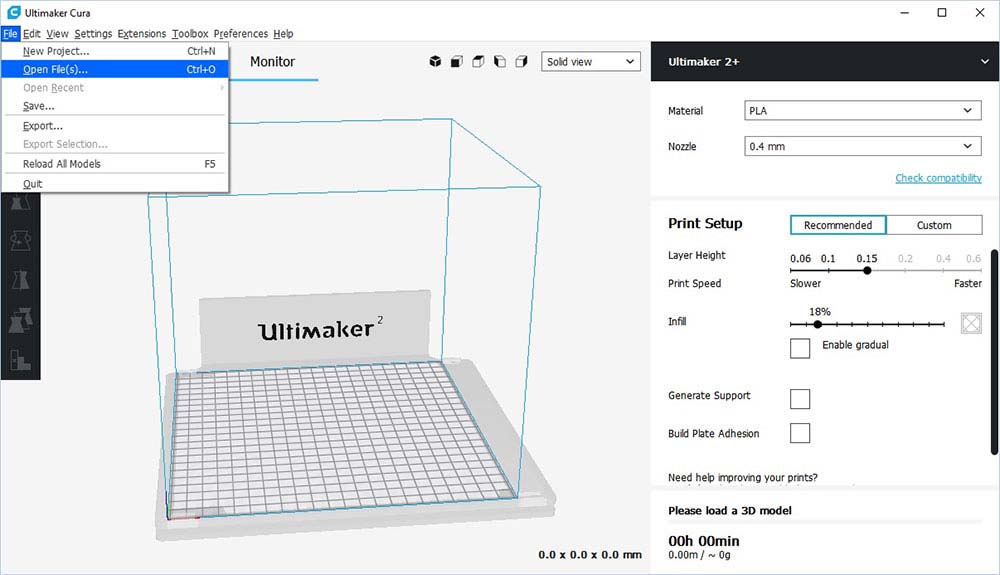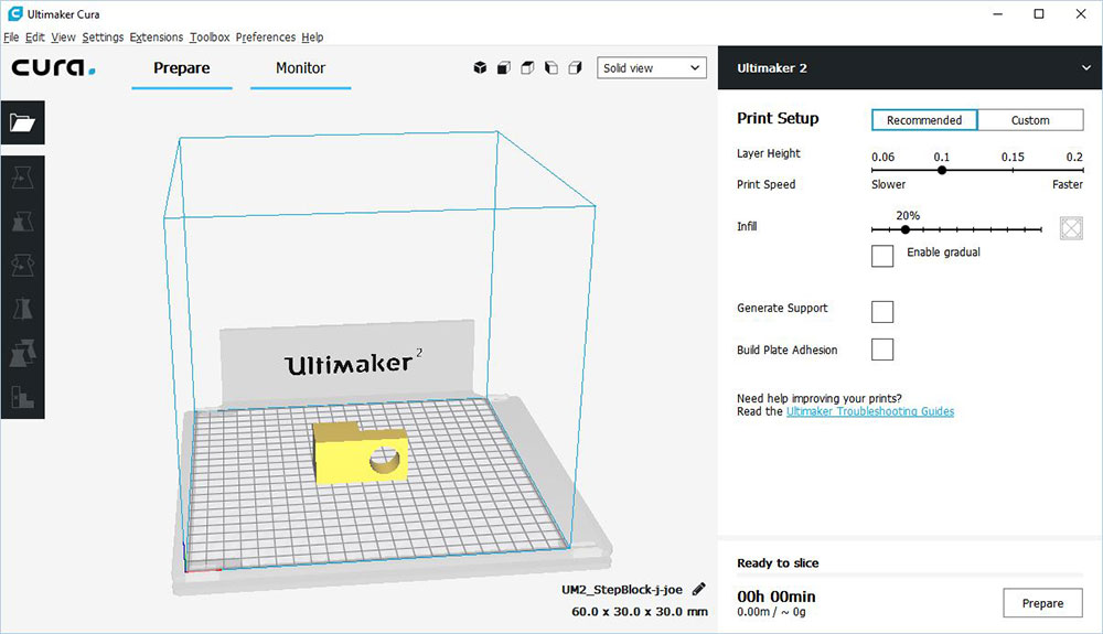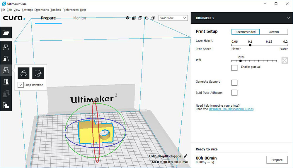 - Application layout:Click on File menu, and select Load Model File, and use the window to select and load your STL model part. At this stage you may need to rotate clicking the rotate tool icon in the lower left corner, which will activate the X, Y, and Z rotate circles. Just drag your object to rotate to a better print setting, for example the step block hole is better printed with the centre perpendicular to the platform
