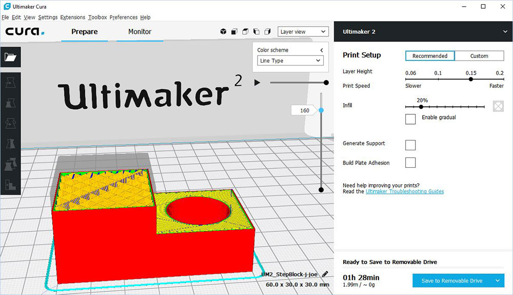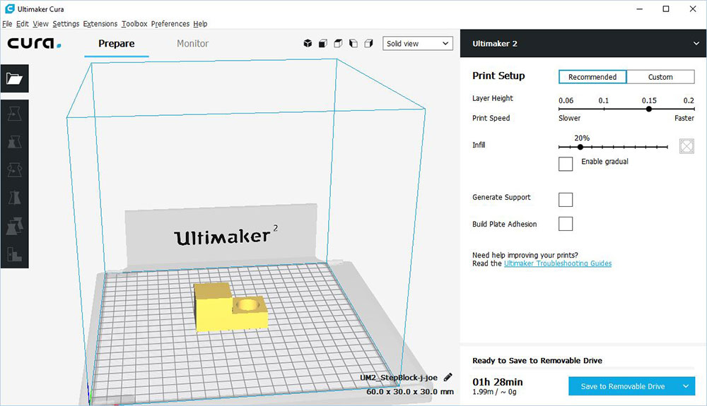 - Save G-Code: Saving the G-CODE is what the Ultimaker 2 will use to print your object, name file using our file naming convention, ex: td2-1_d-joe_2d-step-block_60x30x30mmand.GCODE, then save. Note if you make changes to your STL file while in Cura, you should also save those changes, or the next time you print, you will have to redo the set-up