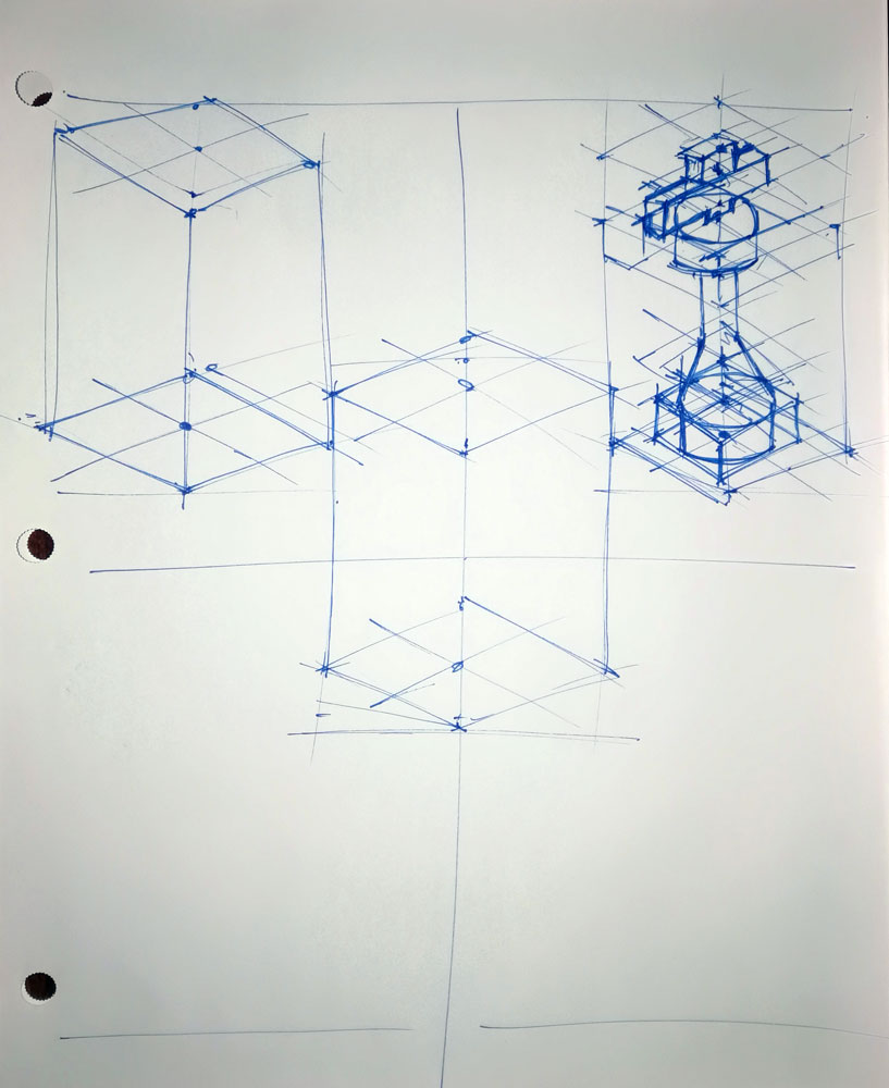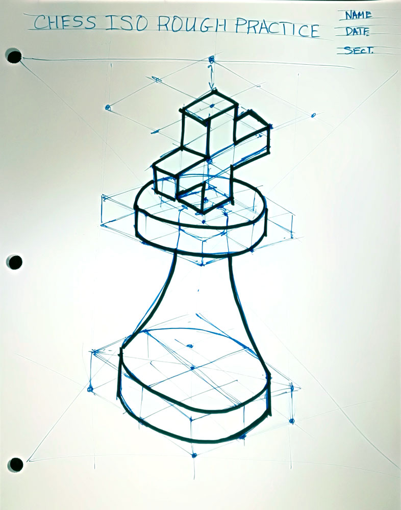 - Last, create your isometric by blocking in a wired cube/rectangle using additive/subtractive construction build sketch process with construction lines, then darken your object lines