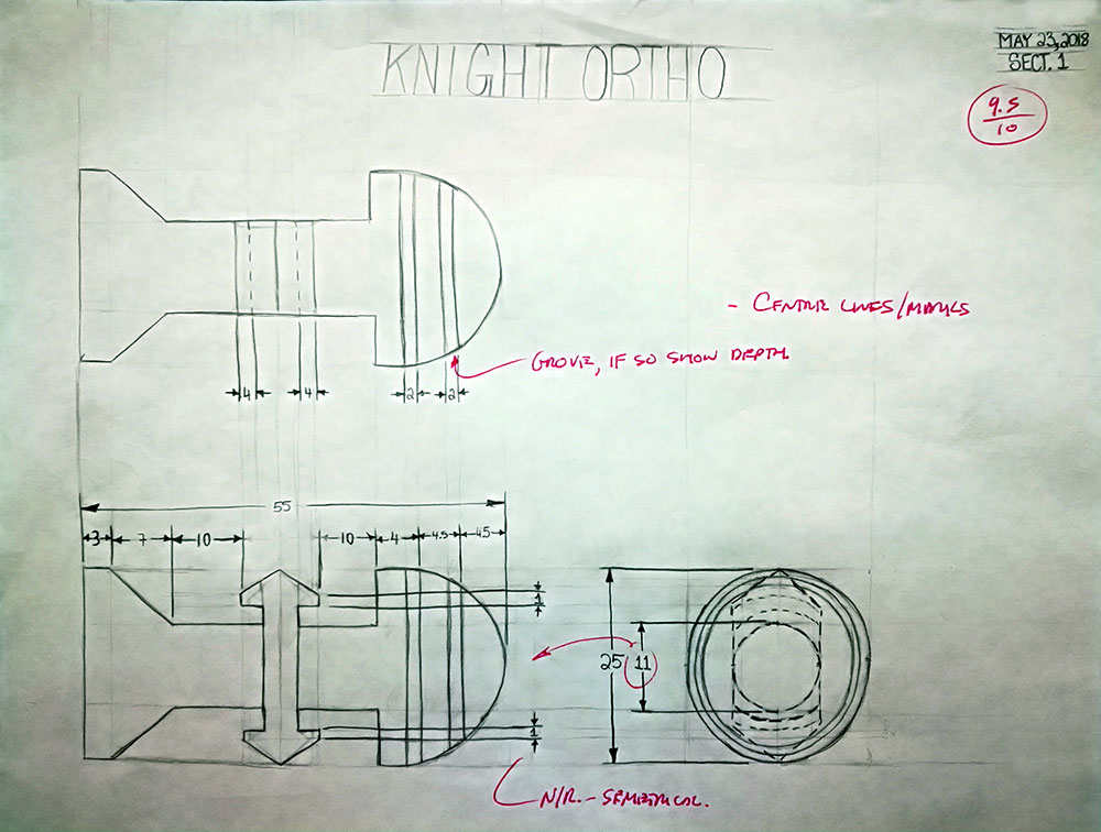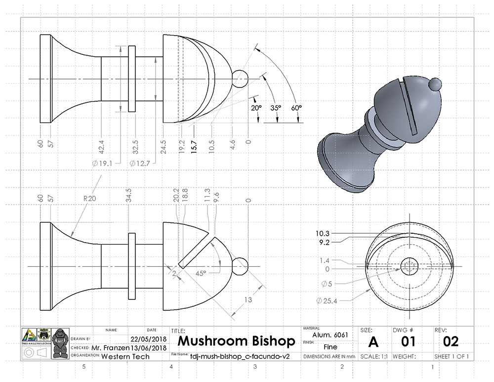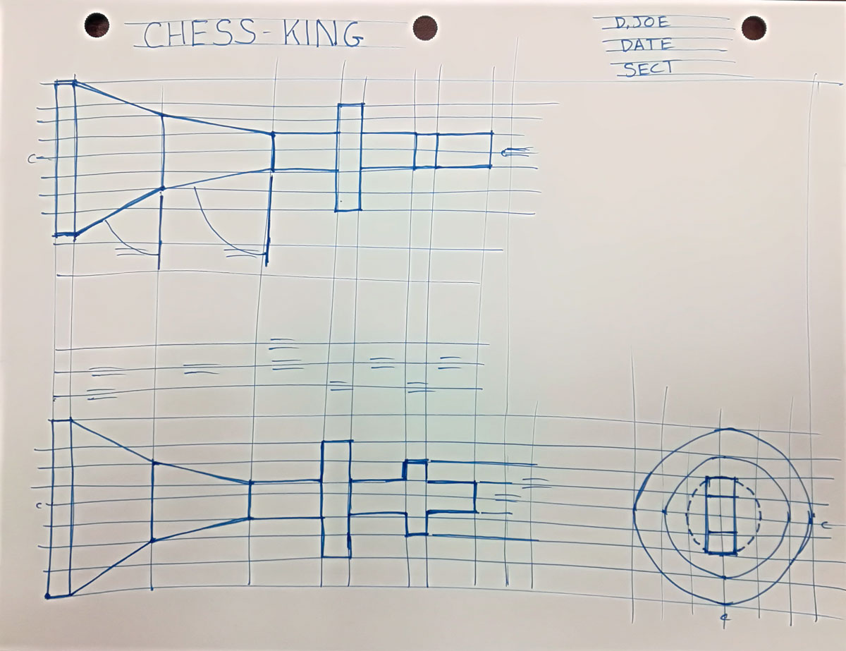 Final ortho sketch to be self and peer evaluated using Ortho Sketch Checklist PDF and combine with your ortho sketch scanned PDF, for one file submissio. CAD Model and drawing to also be self and peer evaluated using OnShape Model/DWG Checklist PDF, to be handed with your OnShape CAD share link with full edit access, correctly named, ex: td3-1_d-joe_chess-piece_P_king-75x25.4mm.