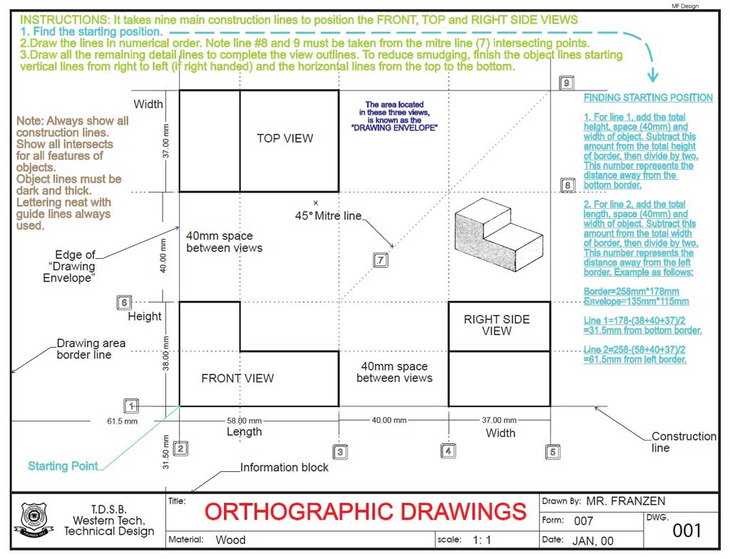 1 - 7 is a orthographic note, shown in order of creation, from blocking in views to finished sketch. After, labels that are not normally included in a finished sketch is for your detailed information about the process, parts of the sketch, sizing, and locations of specific components sketched.