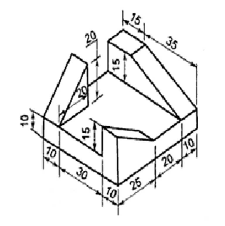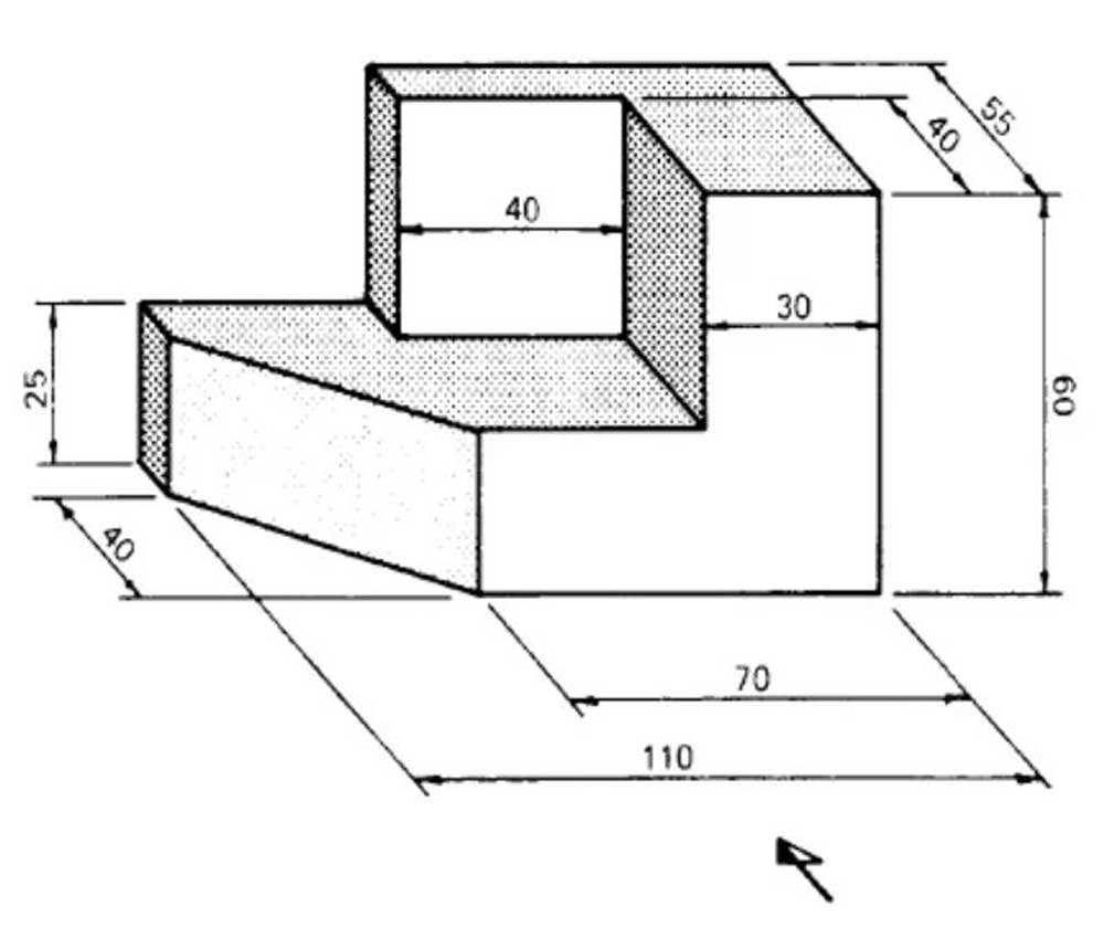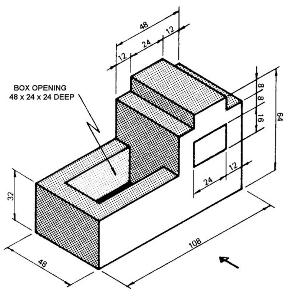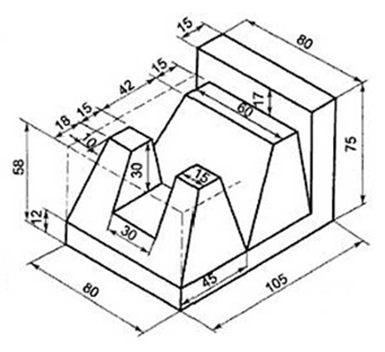 The following three images are showing a third angle projected orthographic sketch and dimensions would look like using a standard "step block" shape with a circular hole going through the center of the bottom step.