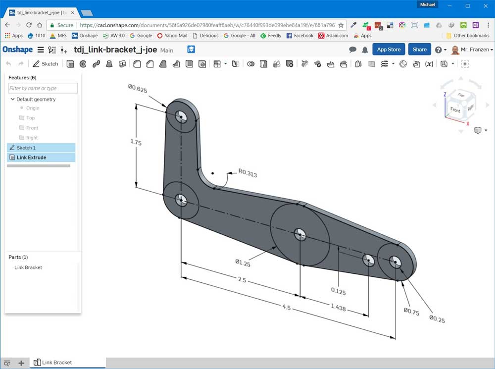 To get familiar with the program a simple Link Bracket tutorial will get you familiar with OnShape. Check out how your OnShape account should be set-up by reviewing the registration steps above, if you don't have an account set-up. You may review intro tutorials from grade 10 section to familiarize yourself with OnShape.