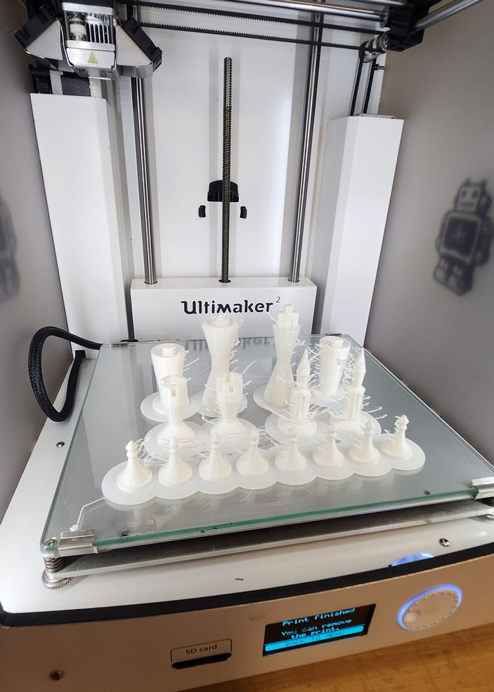 Once you have your final chess or custom piece done, submitted, marked and design is approved for printing, it is time to 3D print it using our in-house 3D Ultimaker printer. Keep in mind, it will take time to print, usually an about an hour and you should be reviewing the support information and process in the Ideas/Investigation section, to prepare your design for print and MUST partner-up with a recent person that has printed to safely print your design.