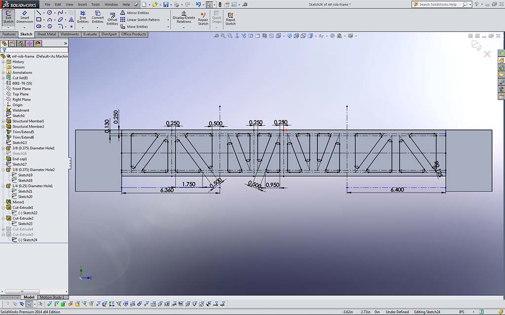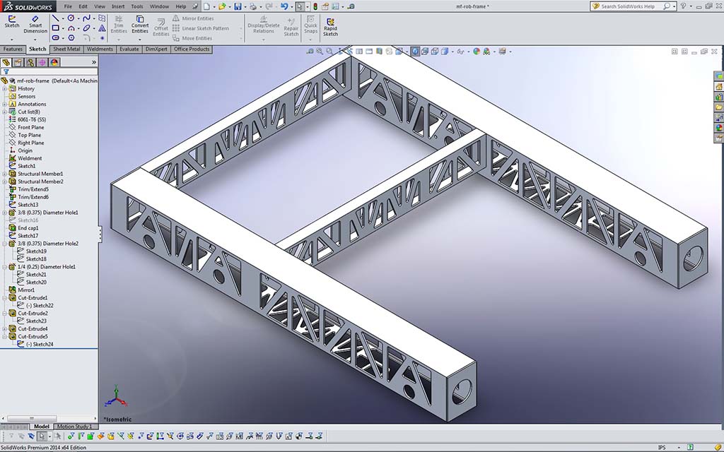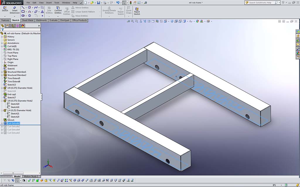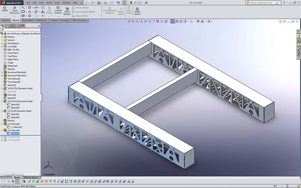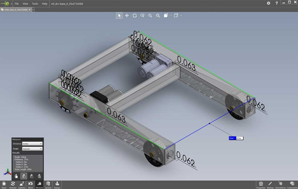 In the pick-up course school network folder, are the edrawing files (accompanied with JPG's) for the robot we will be working on, including the frame. Go to Resource Library > CAD > MF Bot E-Drawings (recommend you make a shortcut to this folder for yourself) and you will find the whole robot, in project sections. You will need to open the first file: mf_drv-base_A_35x27.easm with eDrawings to view and measure what you are going to draw. You can use the Components filter tool in lower left, to Isolate just the frame by selecting it in the components list (4th from the top) and click on the Isolate icon near bottom, to get rid of all drive related components, and also right click on screen background, select View > All Annotations to turn off weld notations for a clean unencumbered view of just the frame.