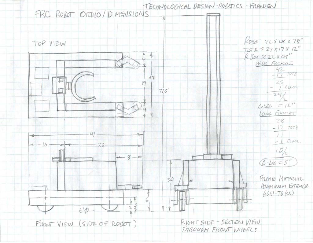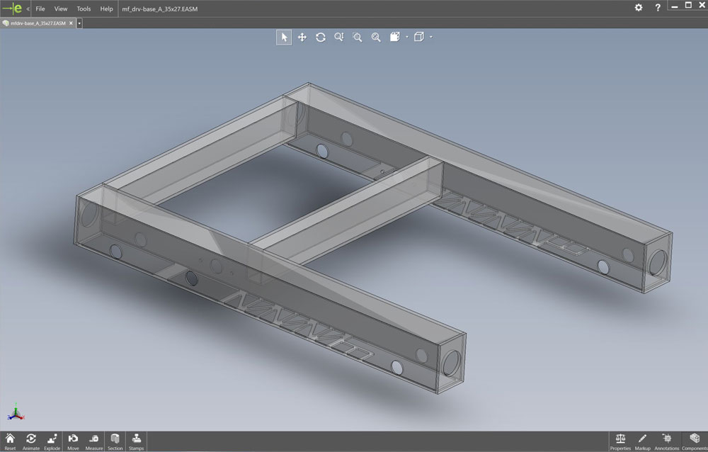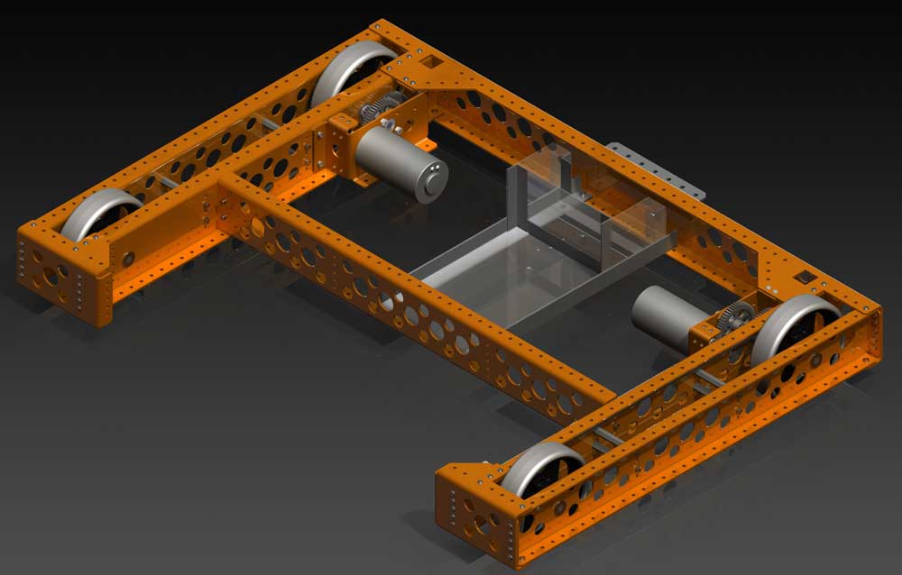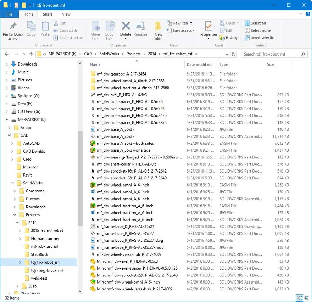 In the pick-up course school network folder, are the edrawing files (accompanied with JPG's) for the robot we will be working on, including the frame. Go to Resource Library > CAD > MF Bot E-Drawings (recommend you make a shortcut to this folder for yourself) and you will find the whole robot, in project sections. You will need to open the first file: mf_drv-base_A_35x27.easm with eDrawings to view and measure what you are going to draw. You can use the Components filter tool in lower left, to Isolate just the frame by selecting it in the components list (4th from the top) and click on the Isolate icon near bottom, to get rid of all drive related components, and also right click on screen background, select View > All Annotations to turn off weld notations for a clean unencumbered view of just the frame.