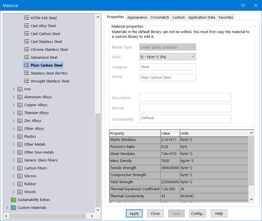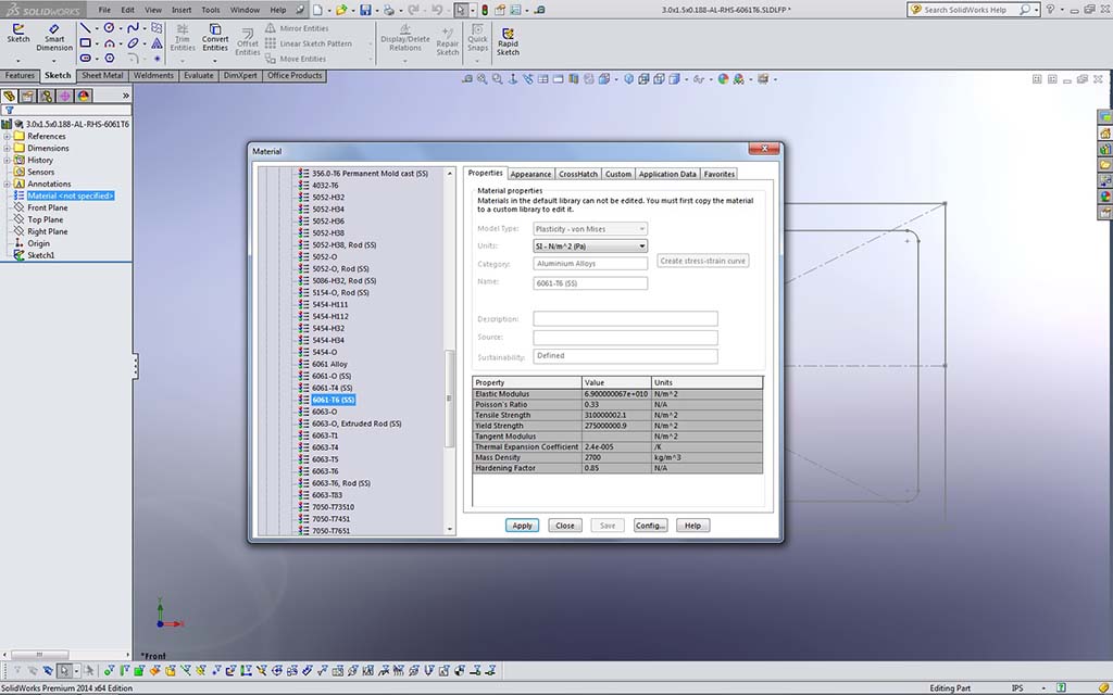 - Select the material grade/type through the material type in the feature tree