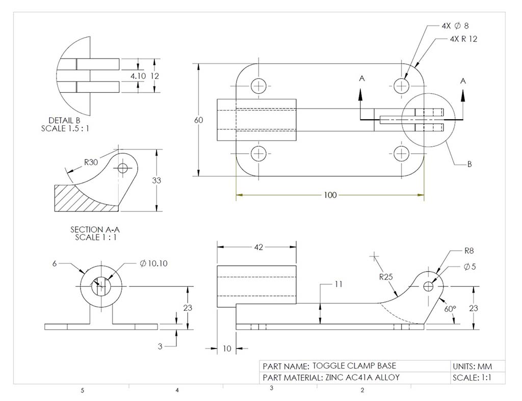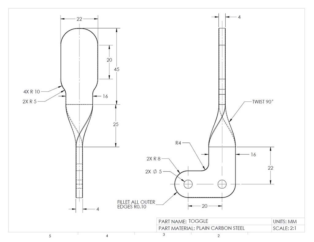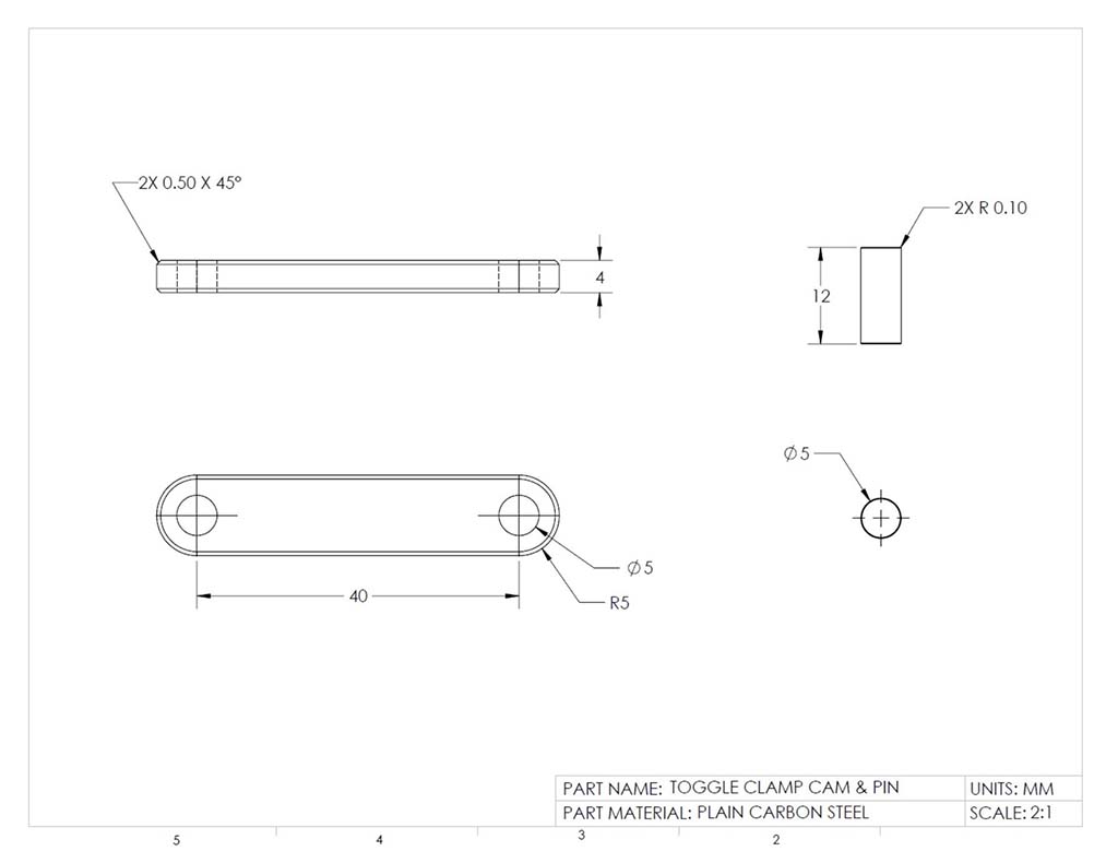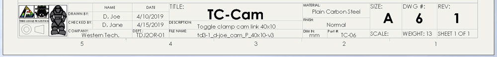 All model parts must be placed based on the three rules for the front view, which should already been taken into account when drawing the initial 2D sketch for the model. Scale, space, and engineering standards for dimensions must be taken into consideration. Overall and detail dimensions must be placed properly with spacing and locations. The shaded ISO will need to be scaled, leaned correctly, and information block filled in correctly, using custom properties, summary information, and notation. Each student will have a custom size for the lengths of the toggle slide, cam, and base times 2, using their number on the alpha list for unique sizing to each student's project.