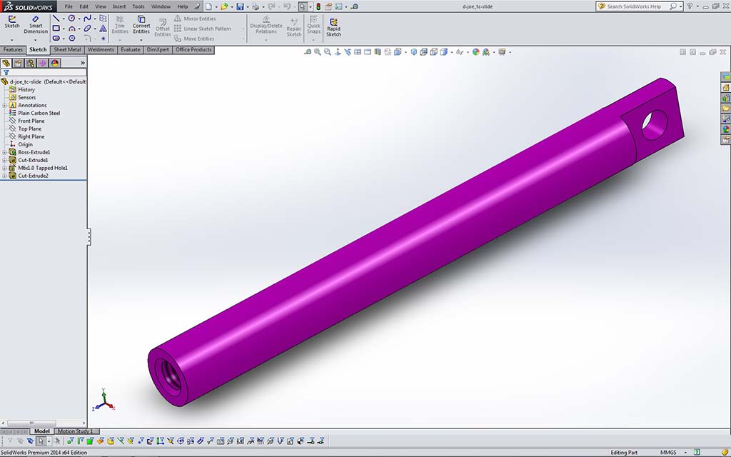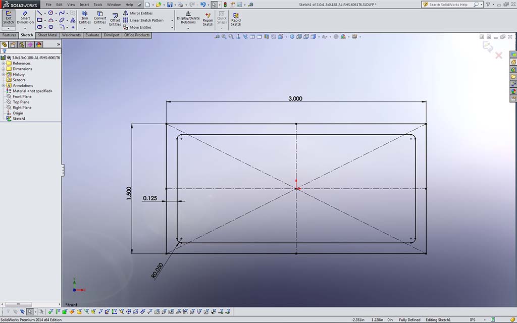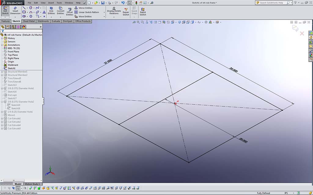 For the sample file the 3D Sketch tool is not necessary and the 2D will be fine. If we needed to do something more complex, as we will need to do later with the elevator frame support, then the 3D will be needed. Instructions are the same with the exception of working in three planes instead of 2. Make sure you create a folder name such as td3-1_d-joe_mf-rob to use for all your CAD files for this project. CAD files you create must use the correct file naming convention the first time you save, such as: td3-1_d-joe_frame-base_P_RHS-AL-35x27.sldprt. See folder- file organization and naming convention for more information.