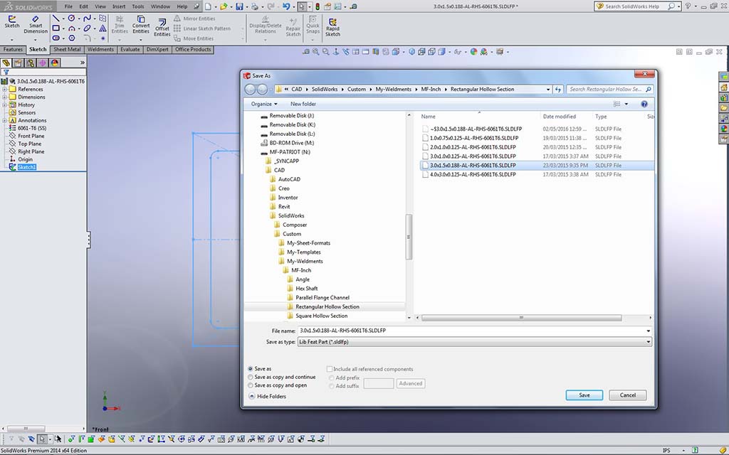 - 3.0x1.5x0.125-AL-RHS-6061T6.SLDLFP - This file naming convention represents: aluminum rectangular hollow section that is 3" deep by 1" wide by 1/8" wall thickness with a material grade of 6061T6