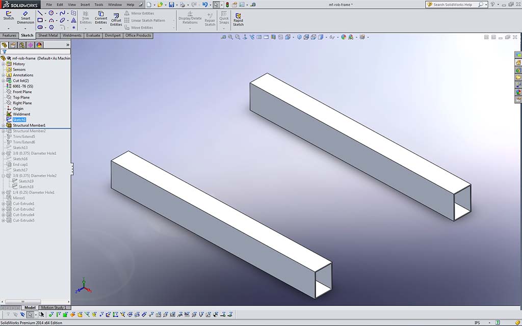 Remember as you create your frame; name features in feature tree, add the summary information, properties, and select the material. Use the image steps 5 to 10 and If you are having problems, there are several related resource videos in the Investigation section near bottom of resource links above that you can check out for more support. The following are general points/steps you should be taking to add your weldment profile to your structural weldment robot frame 2D sketch starting with and shown in Sample 5 2D Sketch above.