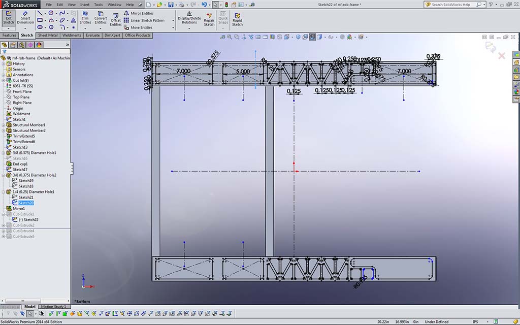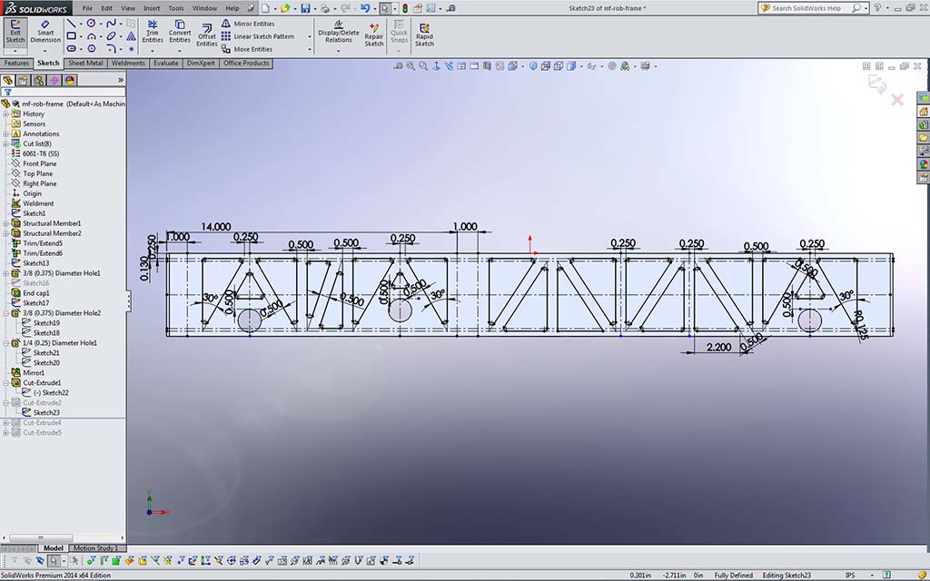 You will also need to create the holes for future bearings, gear box and wheel openings. Wheel holes on the bottom will need to be created on the bottom for wheels, drive sprocket, and chain clearance as shown in eDrawing file: mf_drv-base_A_35x27.easm you have been using. While doing the wheel cut-outs, you can remove some more material to get an idea on one method to remove weight, but still keep the structure intact. Do only the bottom, the sides are not necessary to do for this project. When sketching the cut outs for the wheels and material removal on bottom, note construction lines top and bottom (Sample 17 Bottom Cuts) are used to align all the opening cutout shapes and that the triangle shapes once fully defined are mirrored end to end (Sample 18 Triangle Pattern). Once one bottom piece is done and fully defined, you can, then