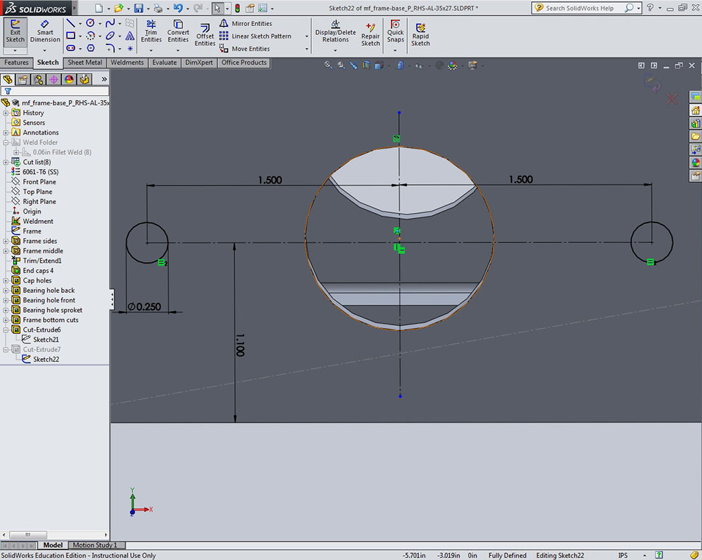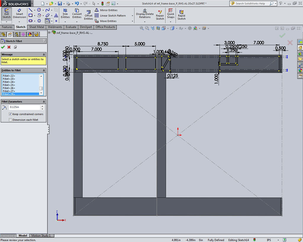 - Add construction lines and reference points to help with inserting on weldment frame