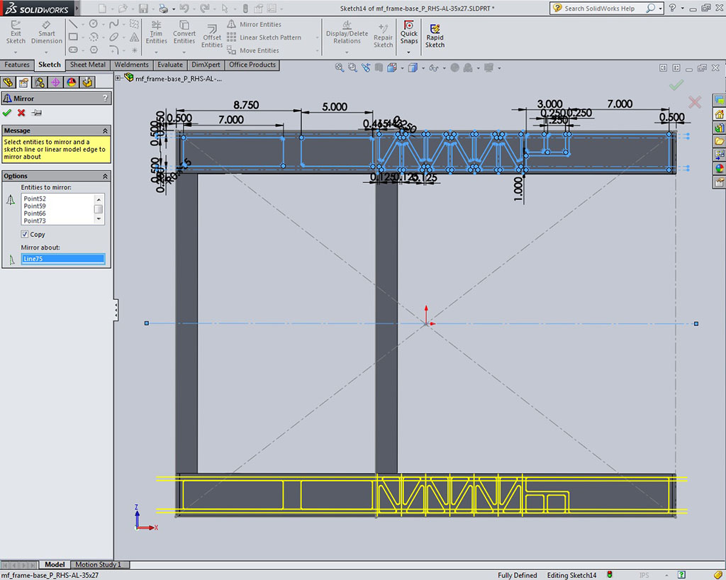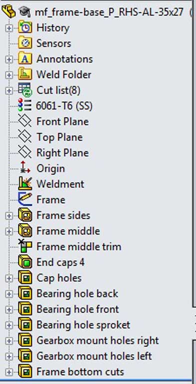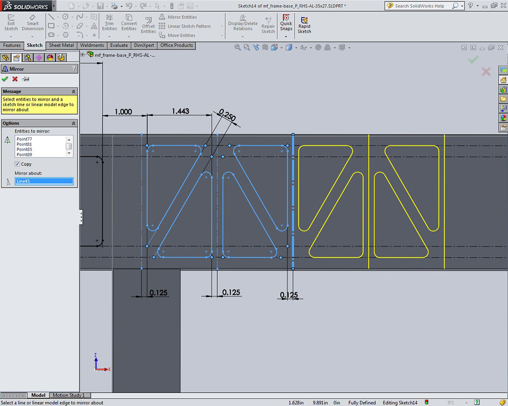 mirror to the other side, 9.34 to save time (Sample 19 Mirror Cut). You will need to place a construction line through the centre to use as your mirror line. Removing the extra material (filleted triangles) adjacent to the wheel and gear box gear areas will lighten the weight of the frame while still keeping the strength of the Rectangular Hollow Section tubing structure at acceptable limits. Further reduction is possible working on the sides, but not necessary for this project lesson, so only do the bottom.