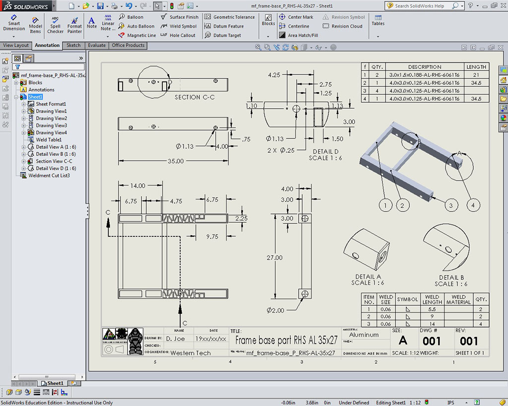 Create practice frame using the drawing sheet or edrawing supplied. The following are key steps that should kept in mind while working on the sample frame. Model and drawing files below show what the finished frame looks like and the sizing required. The instructions below are in-line with