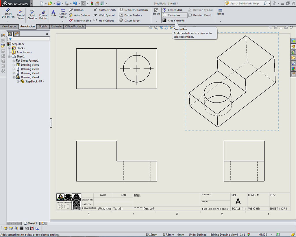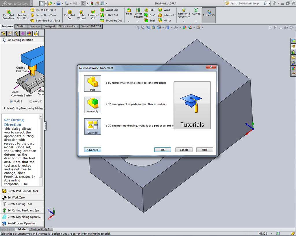 Creating 3D model in SolidWorks with the step block should be straight forward using the steps, pictures, and instructions given. Students should be aware of key information as they go through this step block tutorial such as parametric driven, integrated 3D CAD/CAM/CAE solution, used by discrete manufacturers for mechanical engineering, design and manufacturing. With all of the previous experience with sketching, drawing views, selecting the front view, dimensioning, 2D drawing, and 3D introductory modeling, this should be easy to pick up the basics, as you are already familiar with the previous programs used. The following list are concepts, standards, steps, and terms that you should already be familiar with: