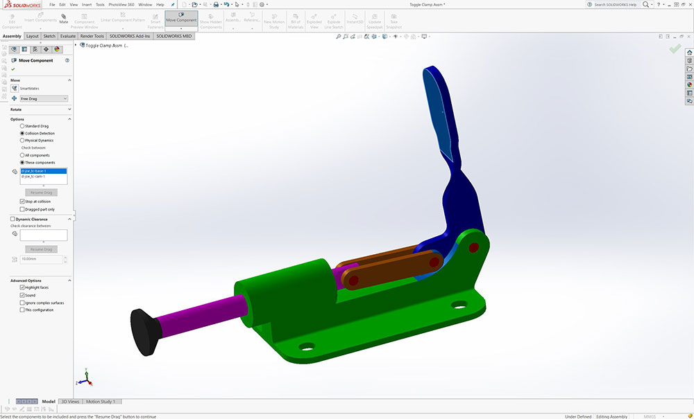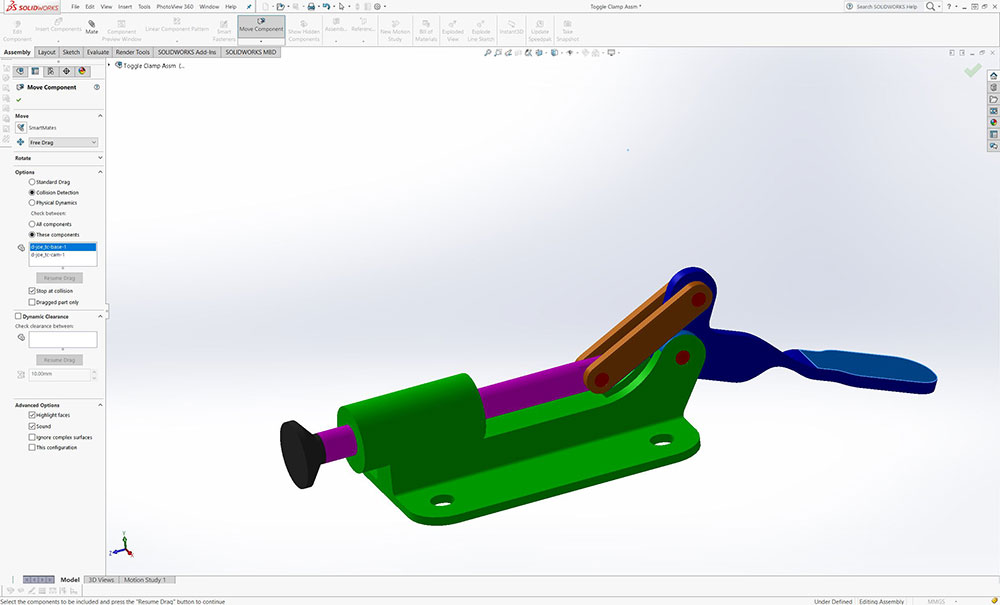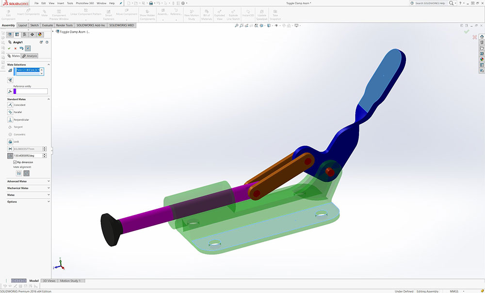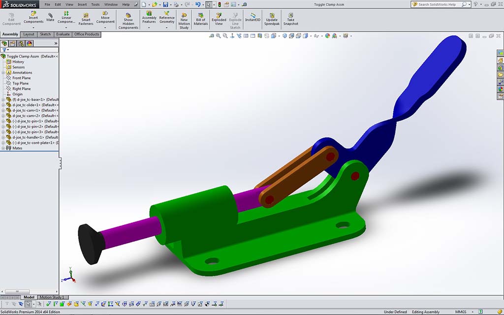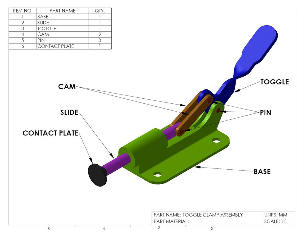 Students are to review and further expand their skill and knowledges using SolidWorks as a tool to help with the engineering design process. Create a toggle clamp assembly in SolidWorks, then create an orthographic drawing sheet set using supplied template drawing file with assembly, exploded with BOM and bubble Id, and all model parts for 8 sheets in one drawing file.