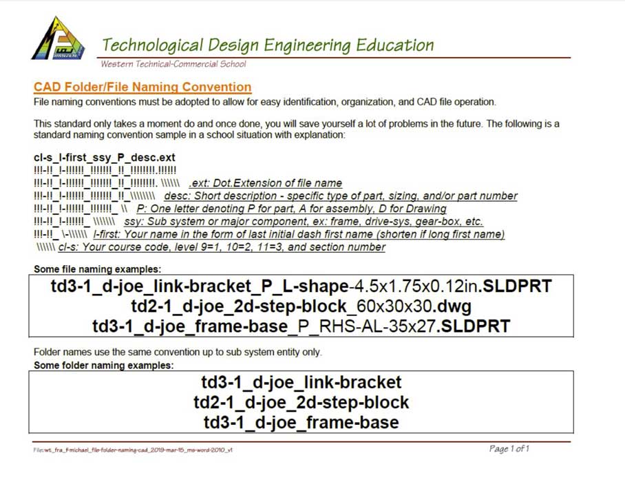 Make sure your folders, files, organization, and naming conventions are saved correctly, files open up to appropriate views (for example model part and/or assembly - full screen with best ISO view), all CAD files working (double check if you change file/folder names), and include full page JPG images of all CAD work. Remember when you hand in your SolidWorks project, make sure you have completed and handed in the SolidWorks Self/Peer Checklist sheet also. This self/peer evaluation sheet (worth 10% of project mark) is there to help you hand in the best product showing your process build and get written feedback on your completed.